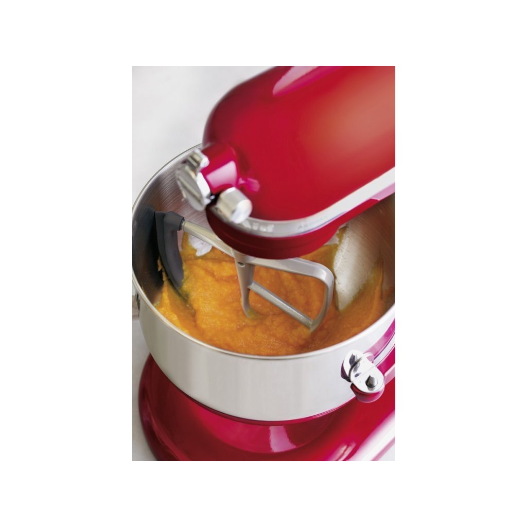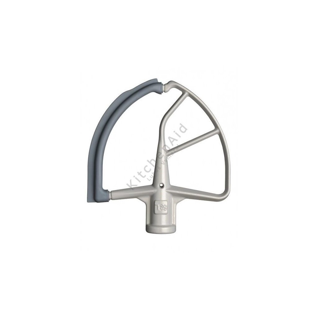 O batedor plano com espátula flexível KitchenAid é feito de alumínio com revestimento de nylon antiaderente, a espátula é feita de silicone. Pode ser lavado na máquina de lavar louça. É um acessório adicional para os processadores de alimentos com uma taça de elevação:
