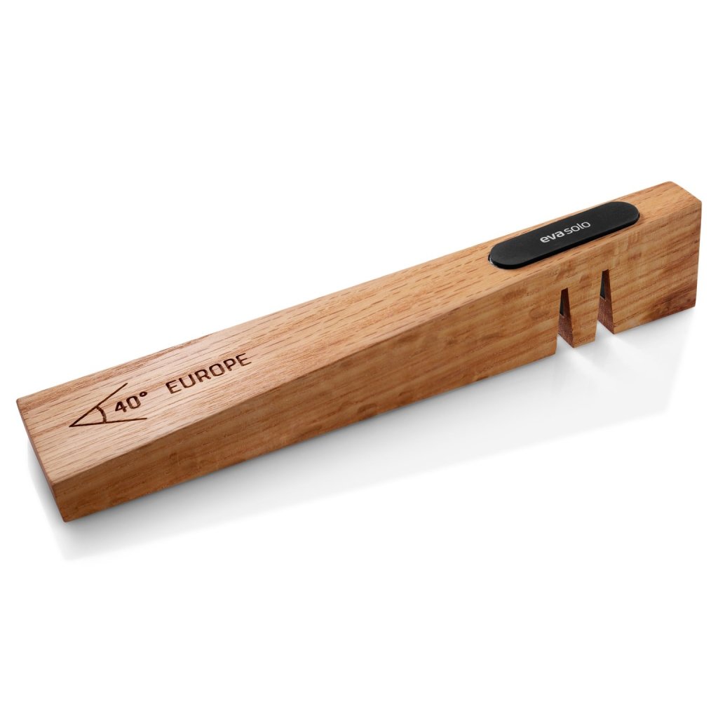 - o corpo em carvalho maciço com pega integrada proporciona uma aderência segura e confortável ao afiar as facas