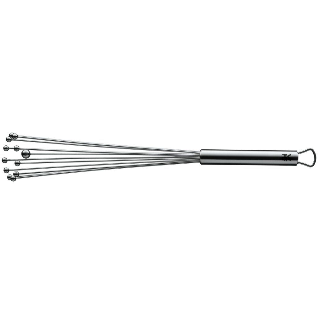 O batedor Profi Plus de 32 cm é uma nova adição à gama de batedeiras. As muitas bolas oscilantes trazem muito ar para a mistura, garantindo que não haja "grumos". Graças à oscilação inerente das bolas nos fios, a sopa é mexida num instante e o creme é limpo em segundos.Os fios alcançam os bordos inferiores da panela ou da taça e, graças à grande área de alcance, não fica nada no fundo. Não fica nada "pendurado" entre os fios, o que torna a vassoura fácil e rápida de lavar e também garante a higiene.