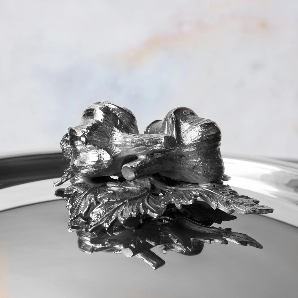 - tampa em aço inoxidável maciço com uma pega com uma bela decoração, moldada à mão em bronze maciço e banhada a prata