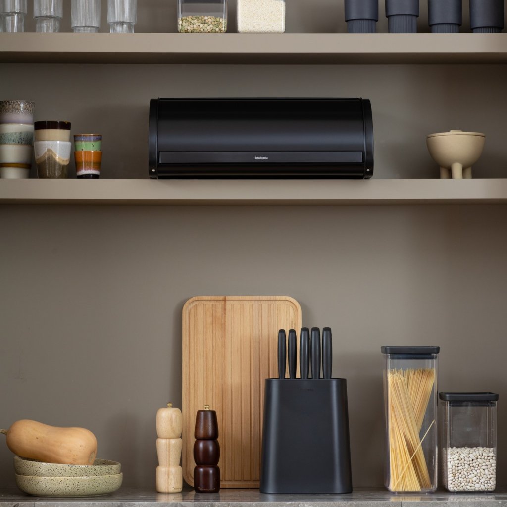 - prático caixa de pão Brabantia ROLL TOP em preto elegante é a solução ideal para armazenar dois pães ou outros doces