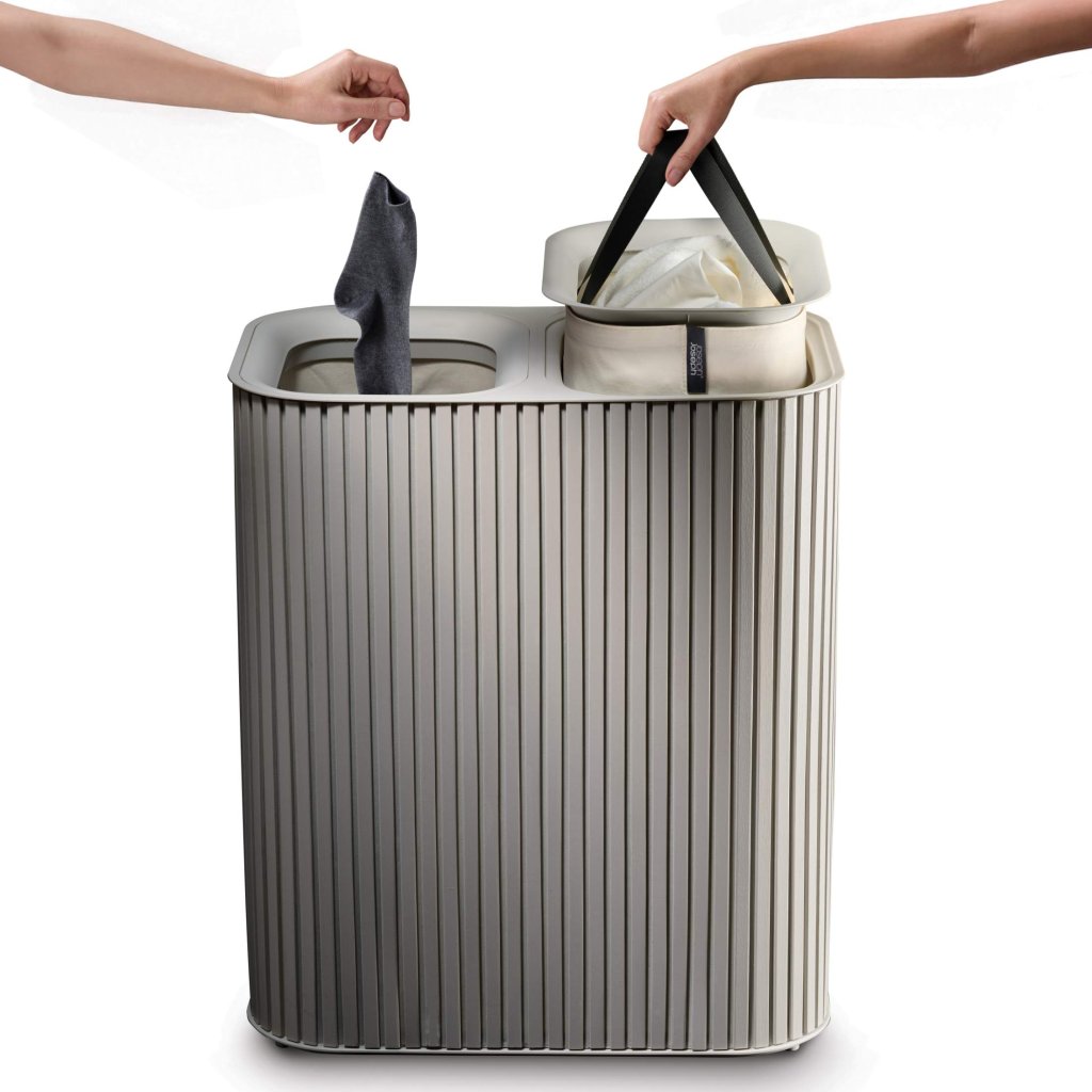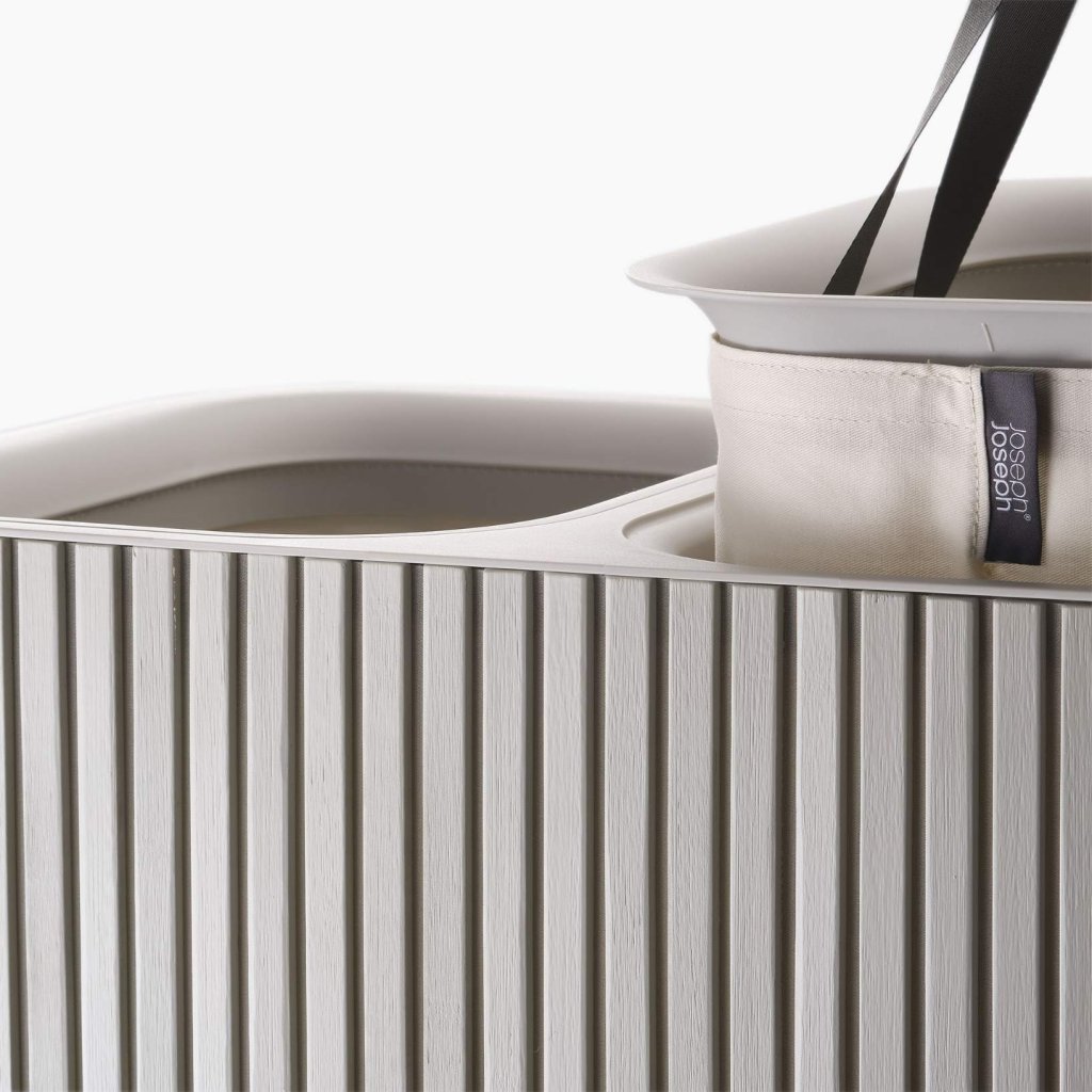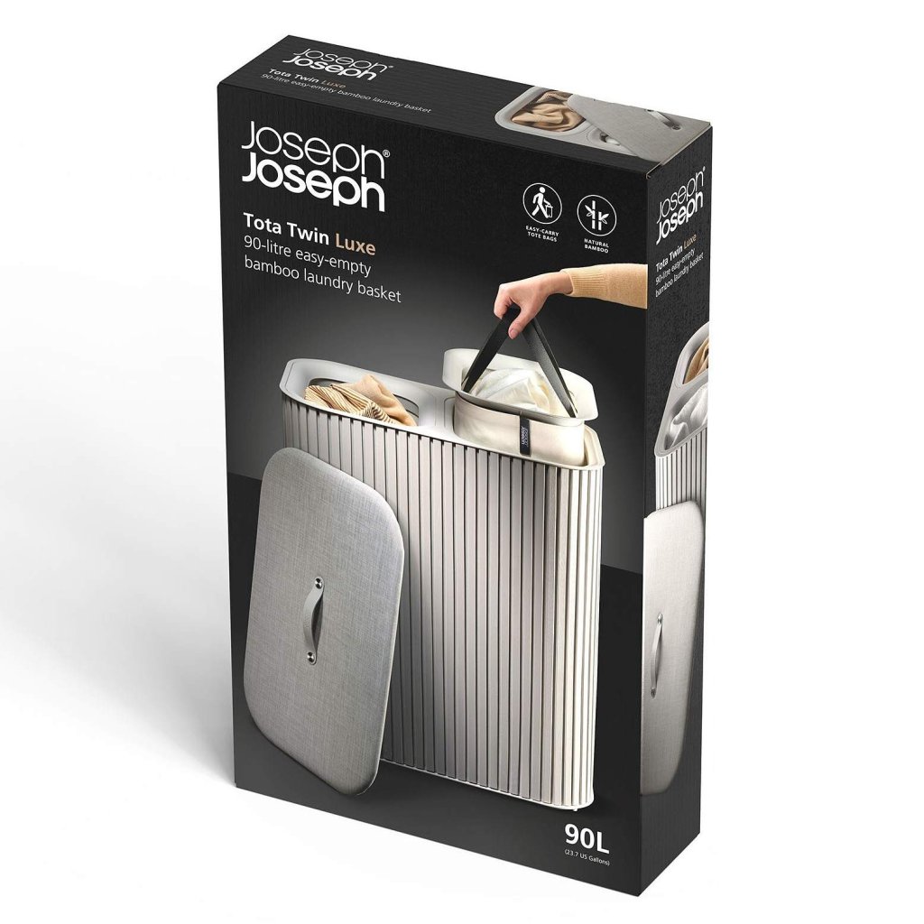 - Cesto de roupa suja Joseph Joseph TOTA LUXE em cru é uma solução elegante e prática para separar a roupa suja em uma casa moderna.