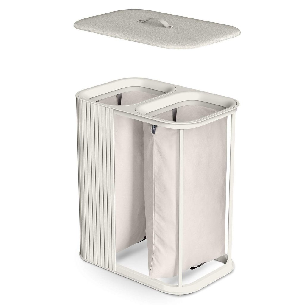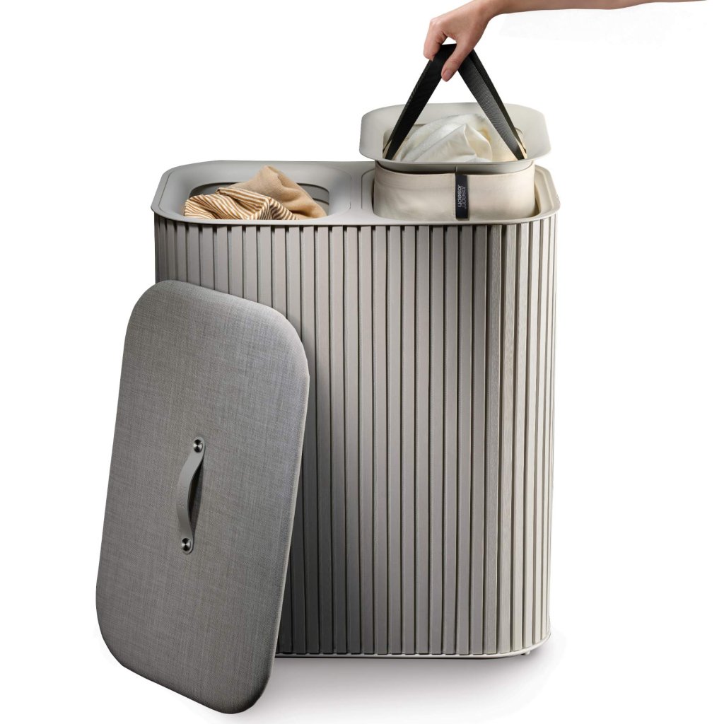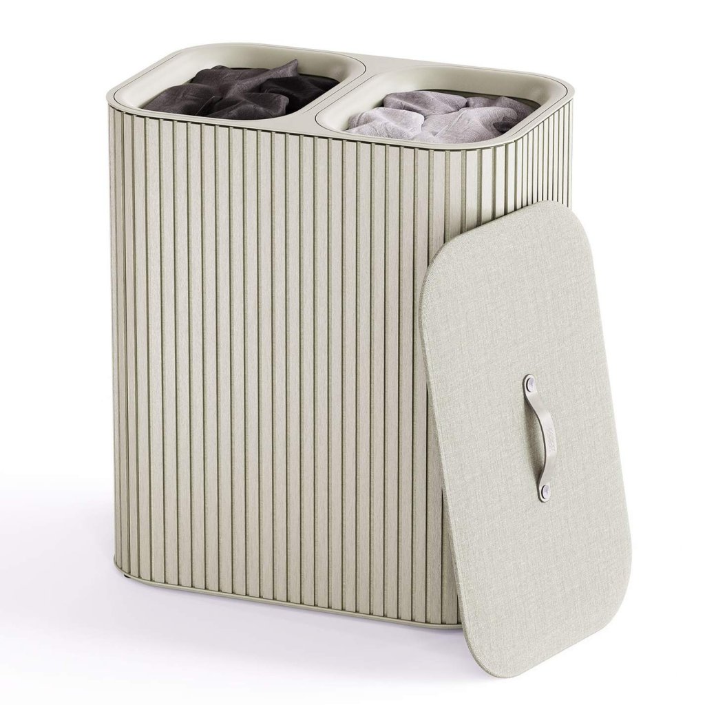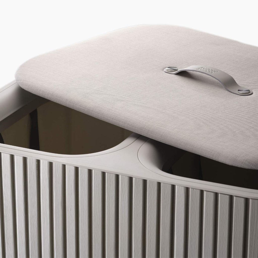 - Cesto de roupa suja Joseph Joseph TOTA LUXE em cru é uma solução elegante e prática para separar a roupa suja em uma casa moderna.