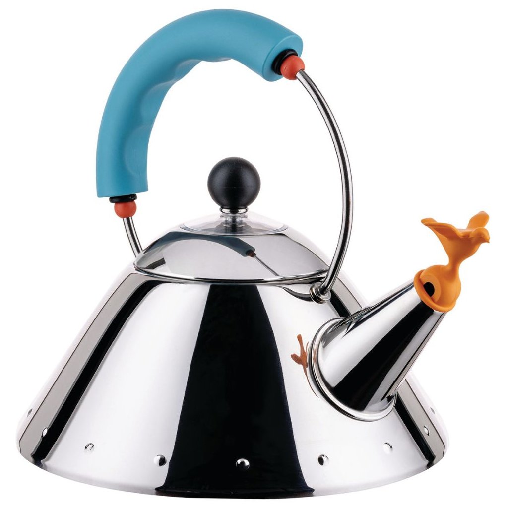 O bule 9093 em aço inoxidável de alta qualidade é um ícone do design industrial moderno. e um dos produtos mais famosos Alessi, o mais vendido na história da empresa. Em 1985, o designer Michael Graves abriu caminho para o design lúdico que se tornou uma tendência na década de 1990. A chaleira está equipada com uma pega e um apito feitos de resina termoplástica e é adequada para todas as fontes de calor, incluindo a indução.