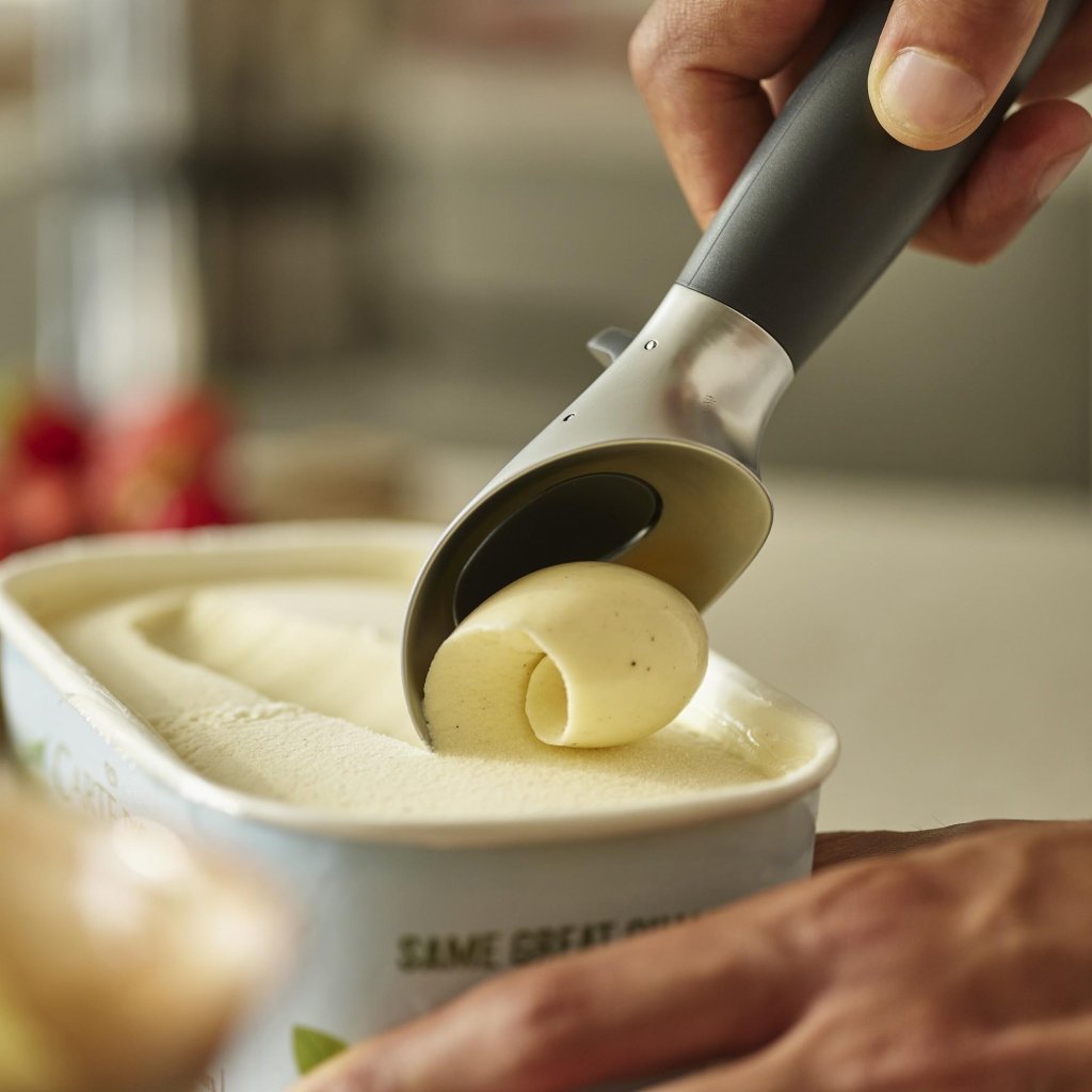 - O cabo com formato ergonômico proporciona uma pegada firme e confortável ao servir sorvete ou outras sobremesas congeladas.
