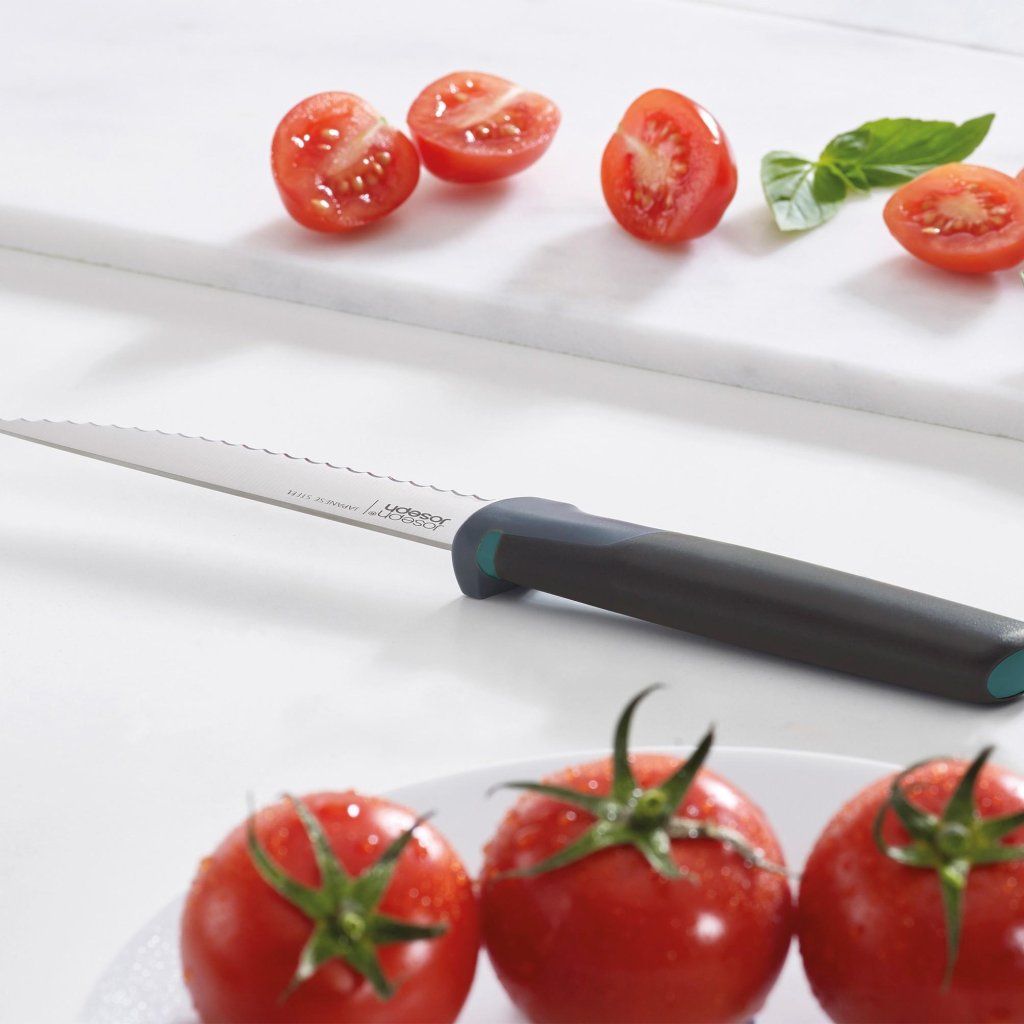 - A faca serrilhada com lâmina de 11,5 cm é prática para alimentos com casca mais firme, como tomates ou pães pequenos.