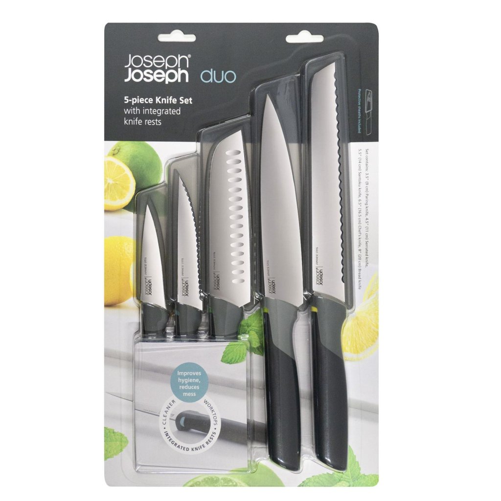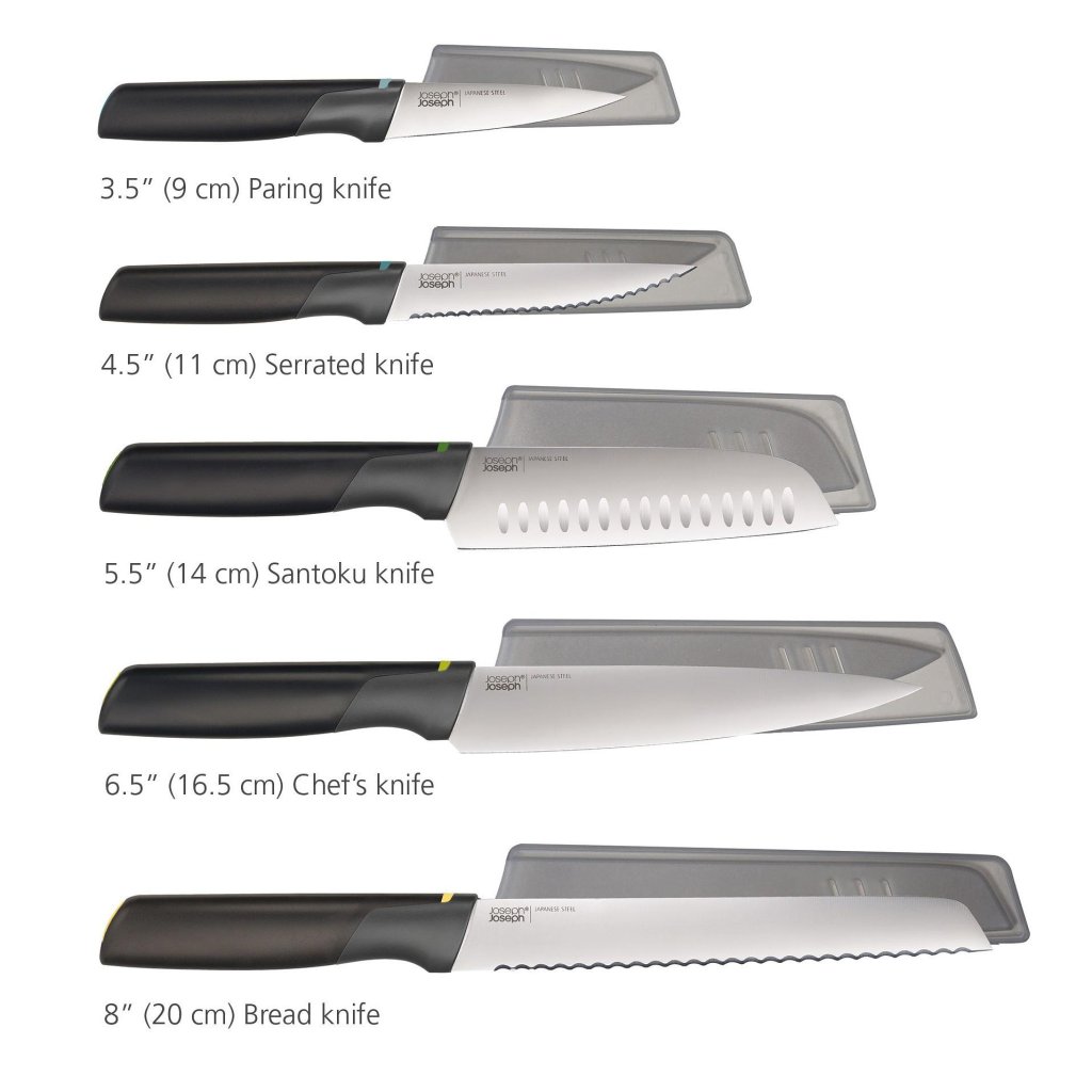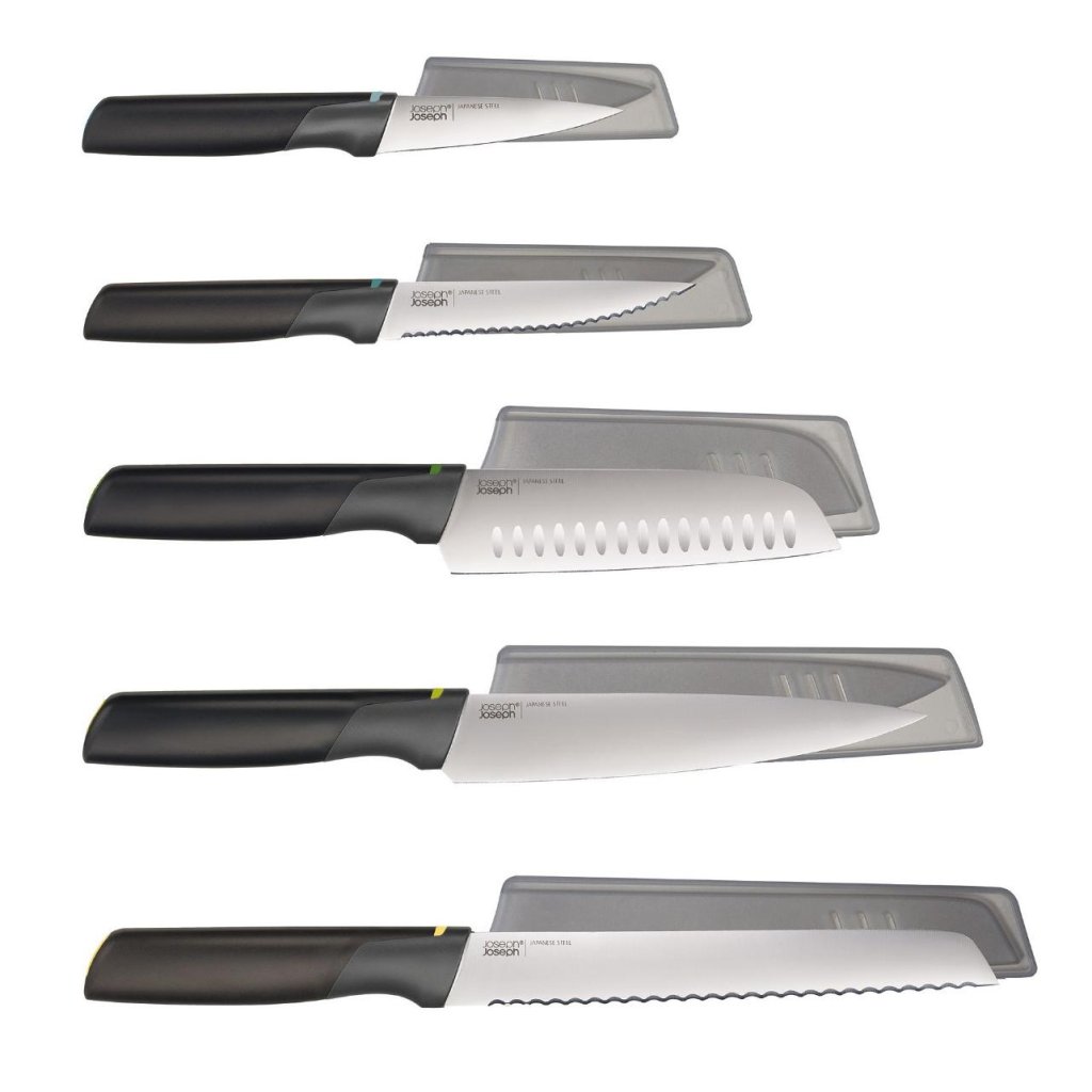 - O conjunto de 5 facas de cozinha Joseph Joseph ELEVATE OPAL oferece uma combinação ponderada de facas para o dia a dia, com as quais poderá cortar, porcionar e preparar ingredientes delicados sem ter de procurar outros utensílios.