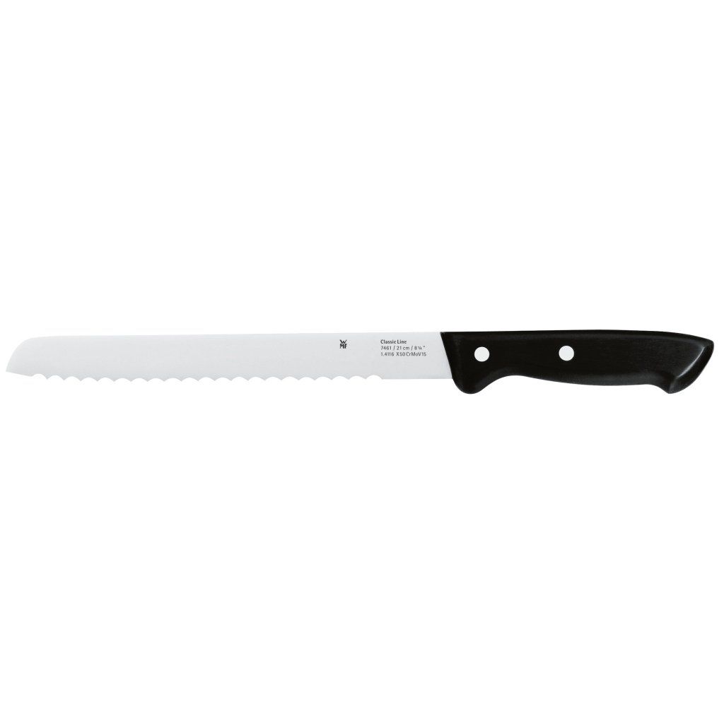 A faca de pão Classic Line tem uma lâmina longa, grossa e serrilhada. Corte suavemente a côdea dura do pão e corte o pão em fatias. A faca de pão também corta fruta sem danificar a sua textura. Graças à lâmina serrilhada, a faca de pão corta a direito e "corta" o que se pretende cortar sem que a lâmina deslize sobre a superfície. A lâmina serrilhada não precisa de ser afiada.