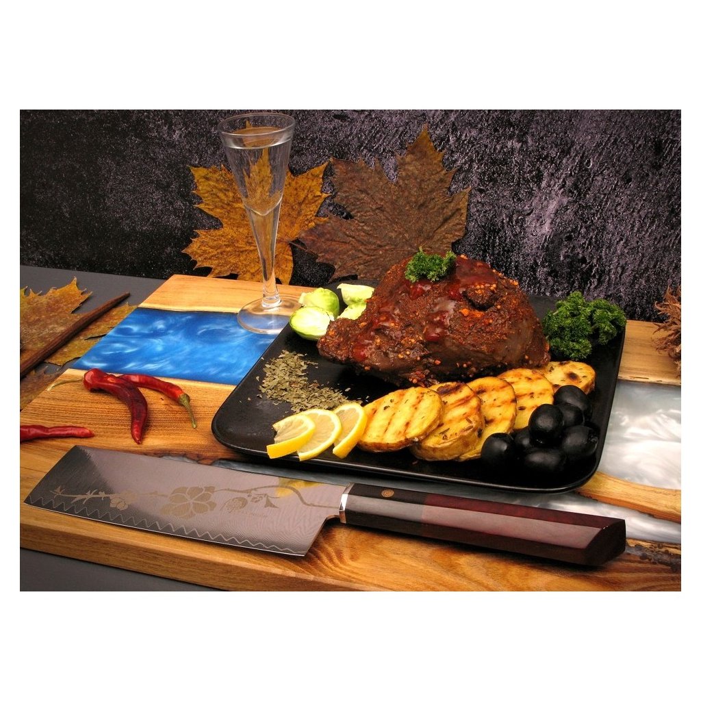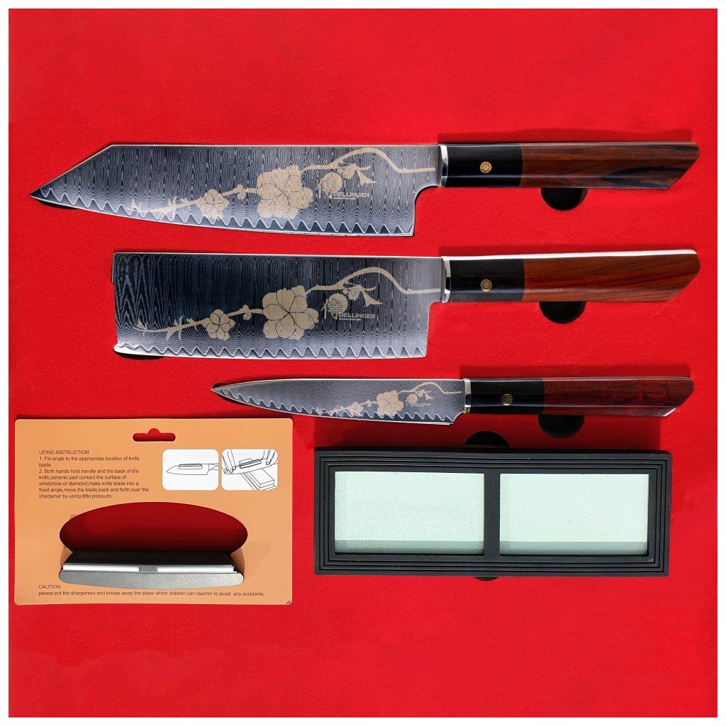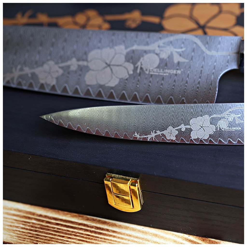 Bonito conjunto de 3 facas Dellinger JOSHI Sakura feitas de aço damasco japonês VG-10 com um impressionante desenho de sakura na lâmina. O núcleo de corte muito afiado e duro, feito de aço vg-10 japonês, está muito bem protegido contra a corrosão por estar ensanduichado entre 66 camadas de 2 aços inoxidáveis SS316 (aço damasco), que asseguram uma durabilidade e resistência excepcionais.