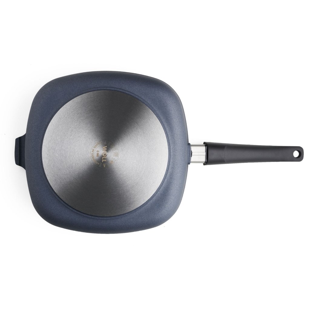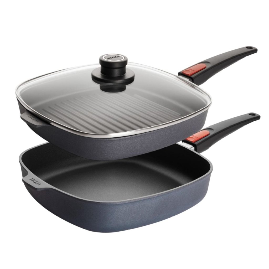 - Inclui uma frigideira quadrada clássica e uma frigideira quadrada frigideira Grill com tampa de vidro, ambas medindo 28 × 28 cm e com cabo removível para máxima flexibilidade.