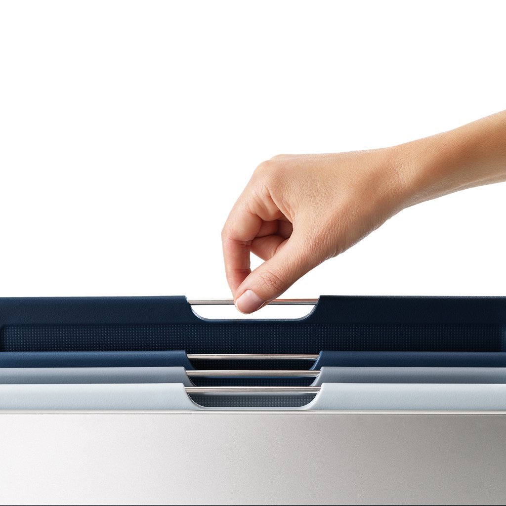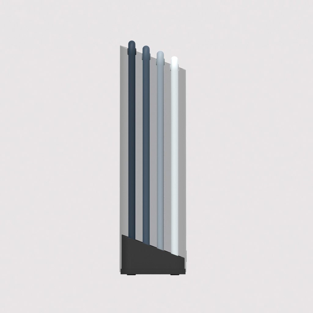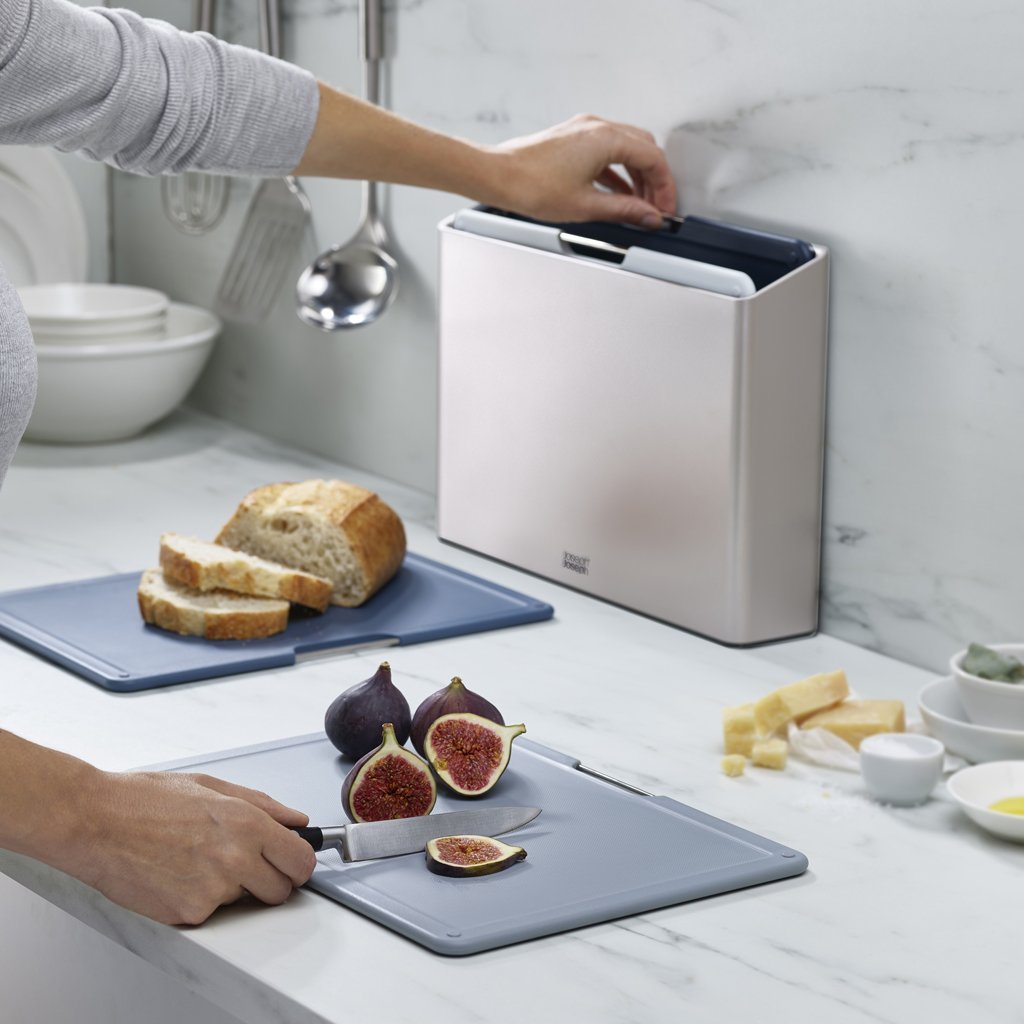 Os pontos fortes das tábuas de corte de plástico são, sem dúvida, a sua fácil manutenção, a higiene e, sobretudo, o facto de serem sensíveis às nossas facas. O objetivo dos designers de Joseph Joseph desta vez era fornecer uma tábua de cortar à mão na bancada, produzir tábuas de cortar únicas para cumprir o objetivo a 100%, e também resolver a sua arrumação elegante. O suporte para tábuas de cortar Folio é um conjunto para as tarefas de cozinha mais comuns.