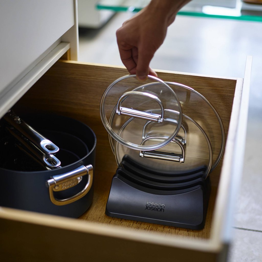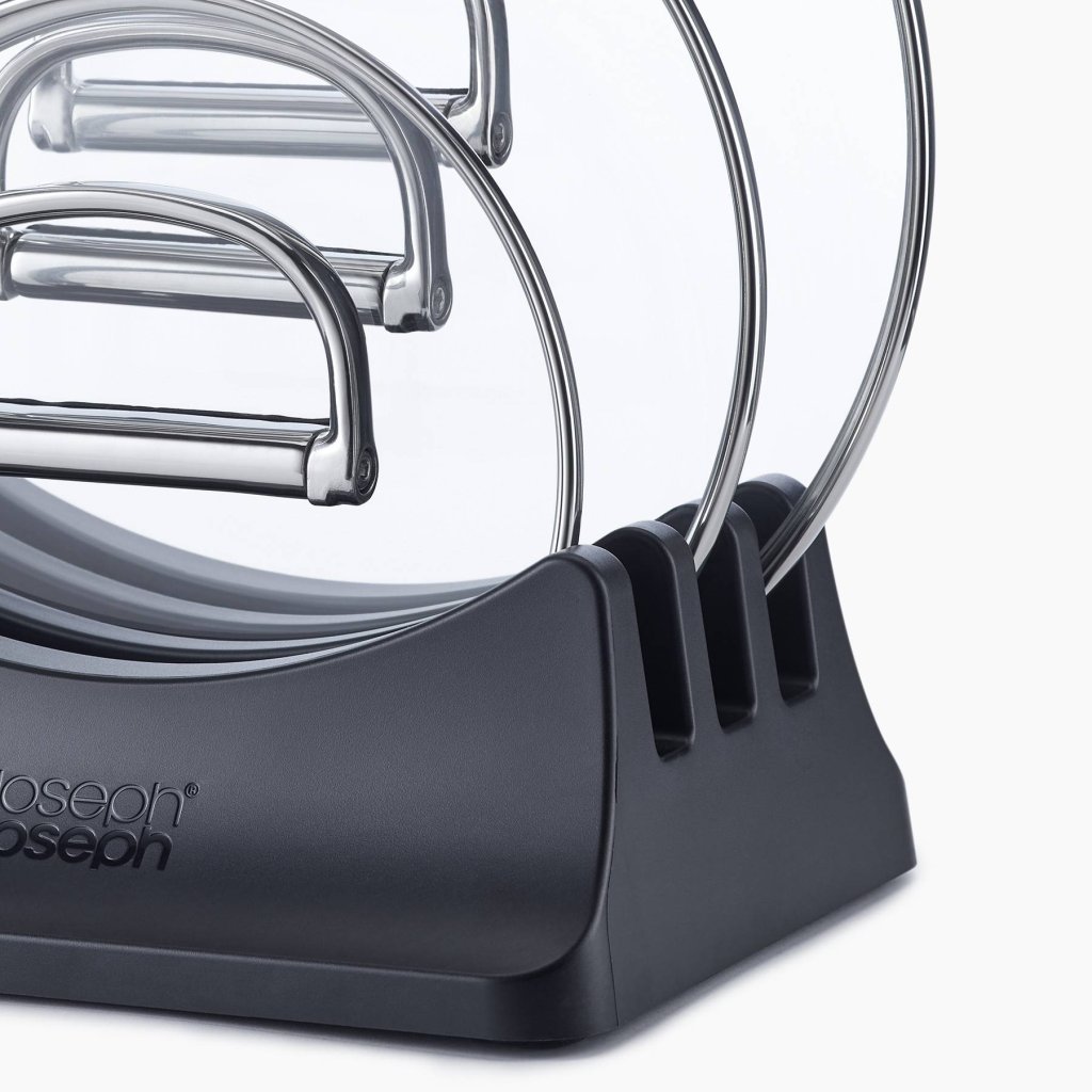 - O pacote inclui um suporte para três tampa de vidro para panela, que garante seu armazenamento organizado e compacto em um armário de cozinha.