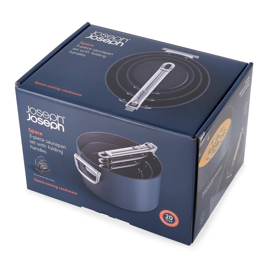 - Graças às pegas dobráveis, as panelas podem ser facilmente empilhadas umas nas outras, poupando até 50% mais espaço de armazenamento em comparação com utensílios de cozinha normais.