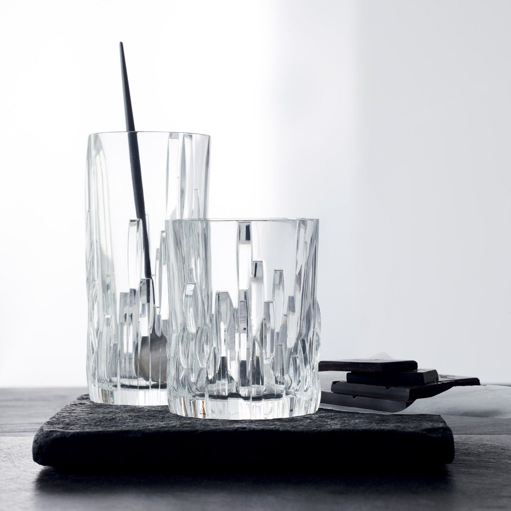 Os copos longos da série Shu Fa do fabricante alemão Nachtmann vão surpreendê-lo à primeira vista e, ao primeiro toque, não vai querer largá-los da mão. Os copos de design são feitos de vidro de cristal de alta qualidade com uma bonita decoração em relevo que se assemelha a rochas ásperas e ao mesmo tempo graciosas. Tanto as bebidas delicadas como as picantes têm um aspeto incrivelmente sedutor e tentam-no a beber mais e mais goles.