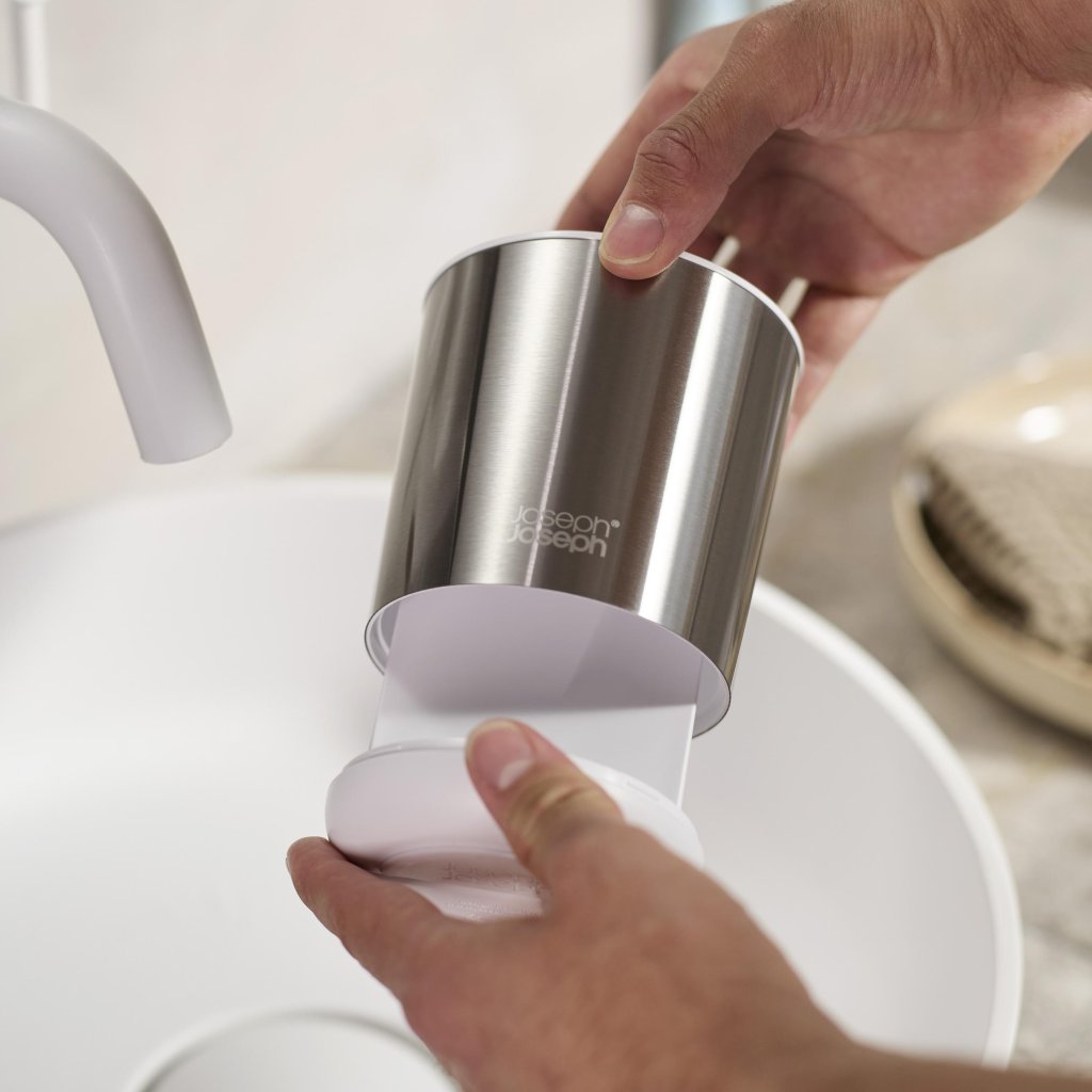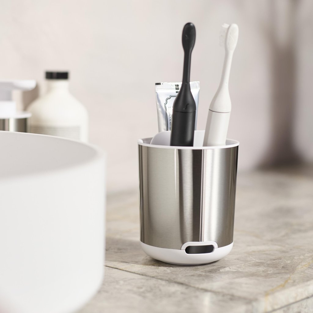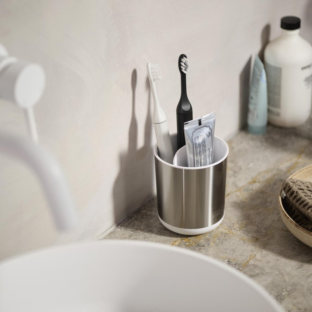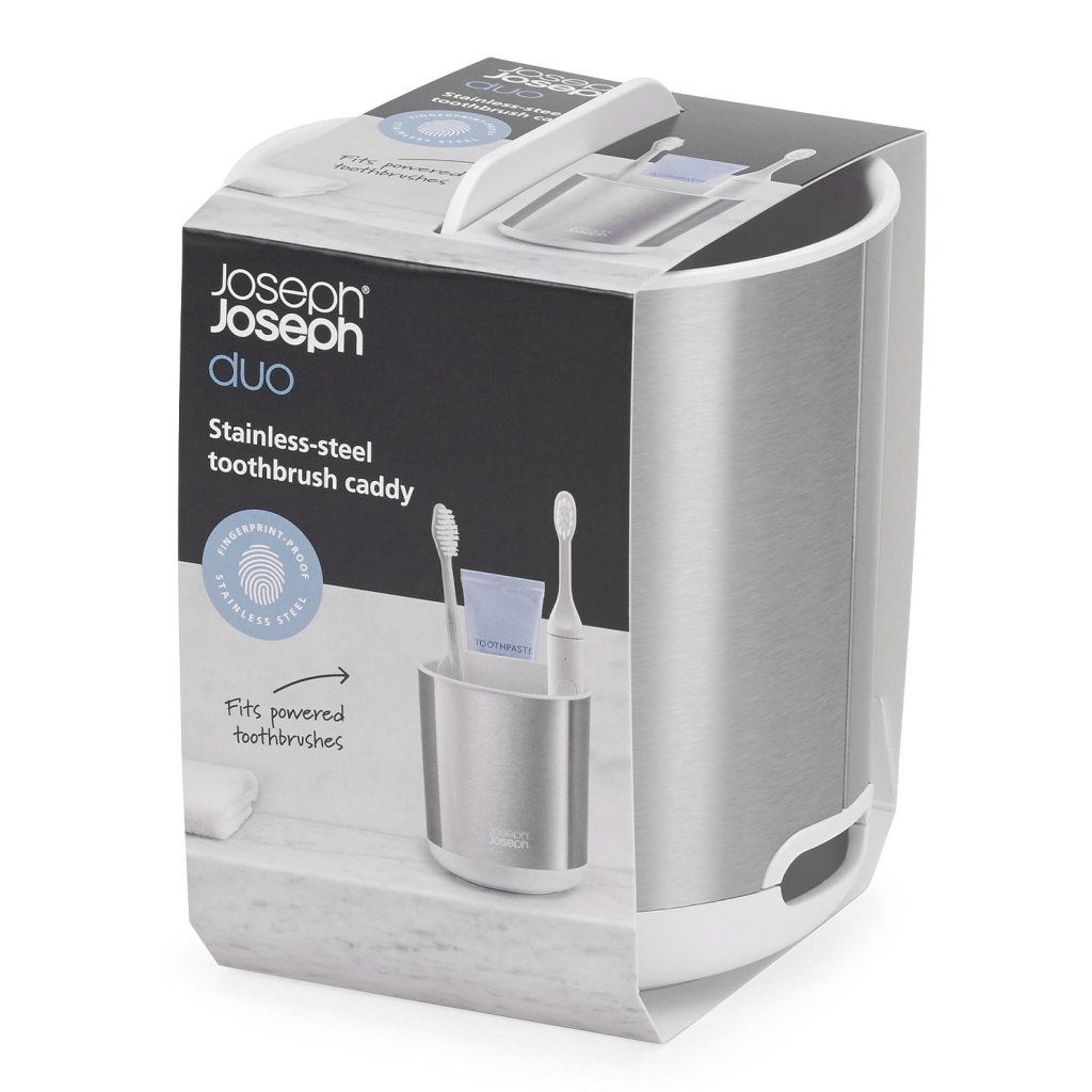 - O suporte para escova de dentes Joseph Joseph DUO STEEL em design compacto combina uma elegante estrutura em aço inoxidável com uma prática divisória interna branca.