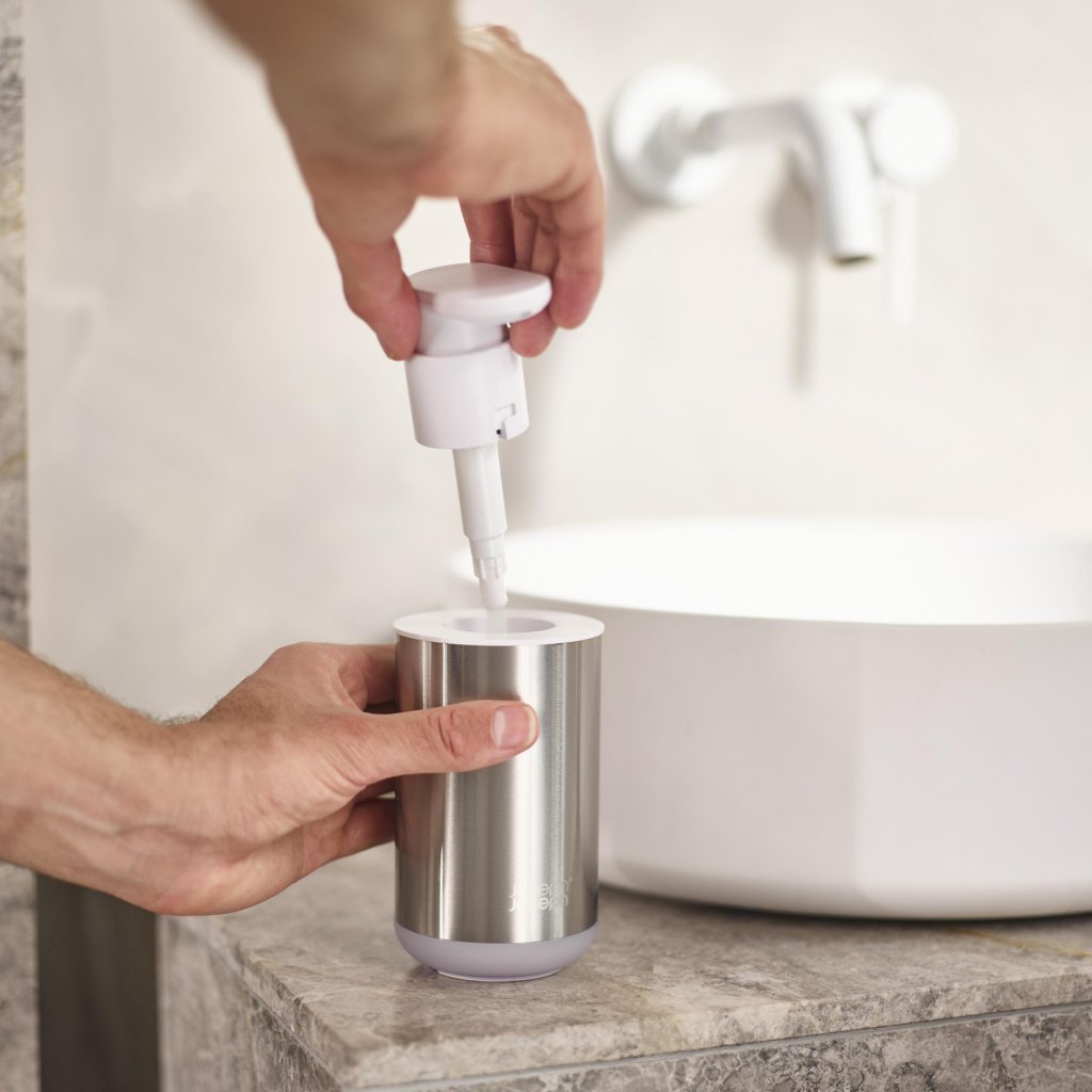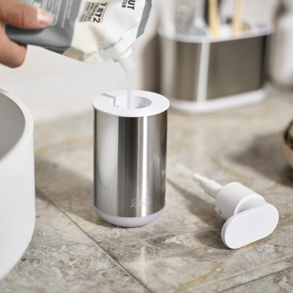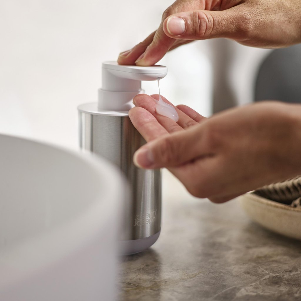 - Dispensadores de sabonete Joseph Joseph DUO 70608, em uma combinação de aço inoxidável e branco, oferece uma solução elegante e moderna para qualquer banheiro ou lavabo.