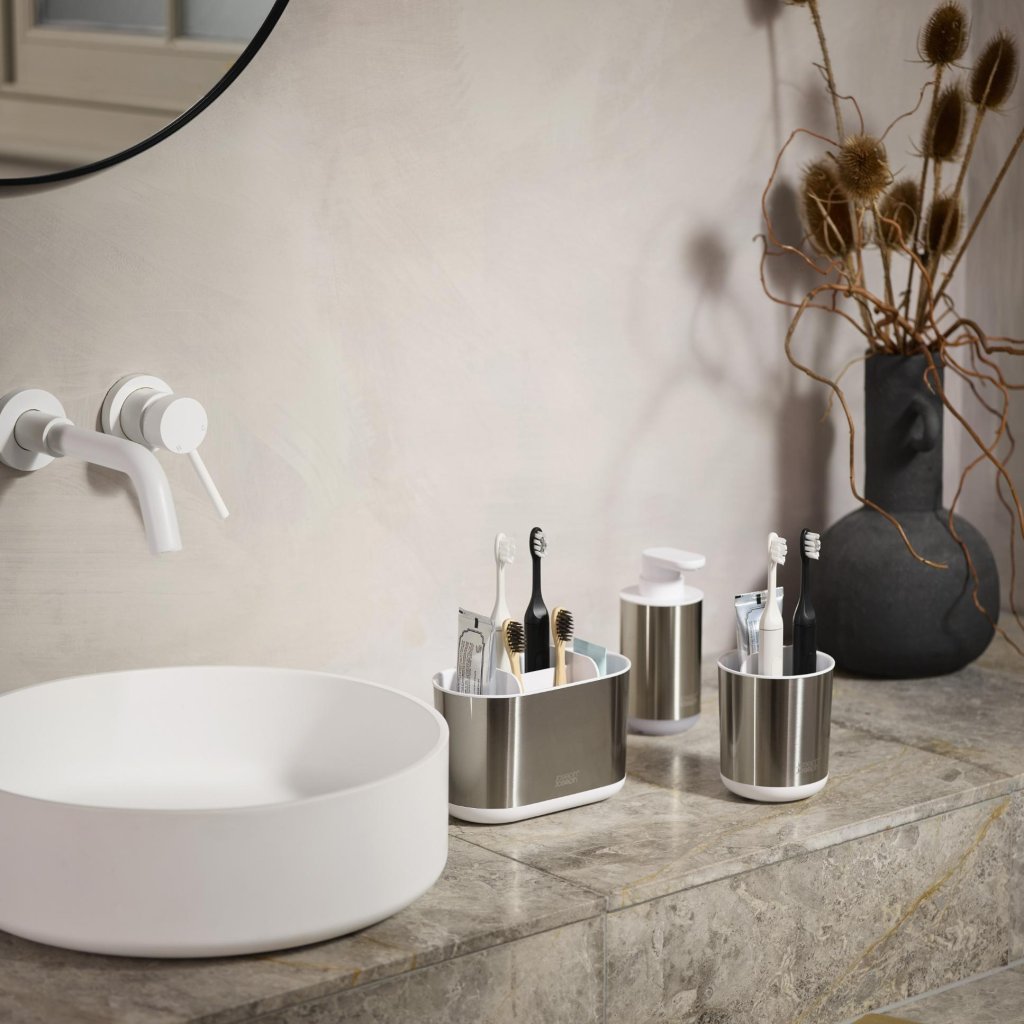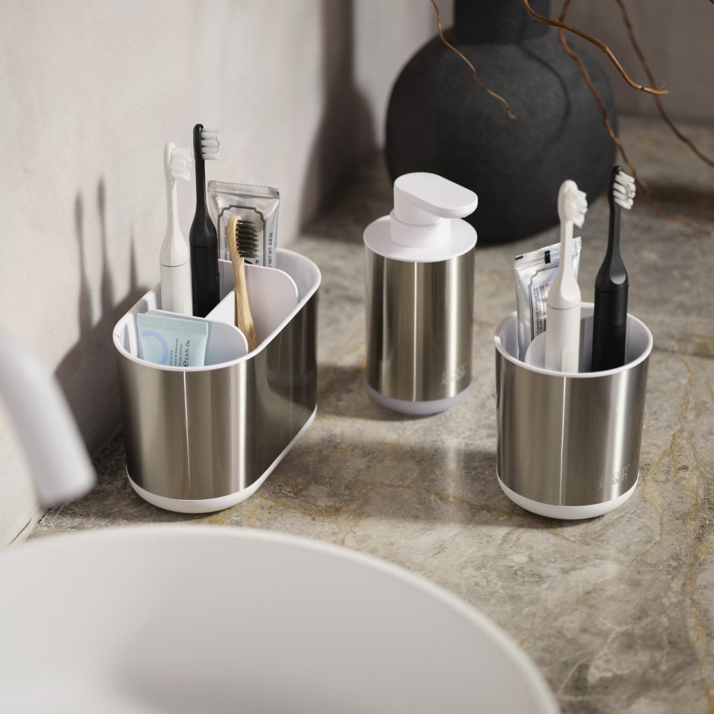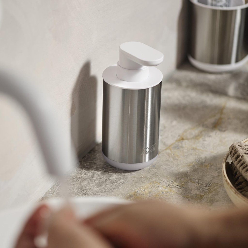 - Dispensadores de sabonete Joseph Joseph DUO 70608, em uma combinação de aço inoxidável e branco, oferece uma solução elegante e moderna para qualquer banheiro ou lavabo.