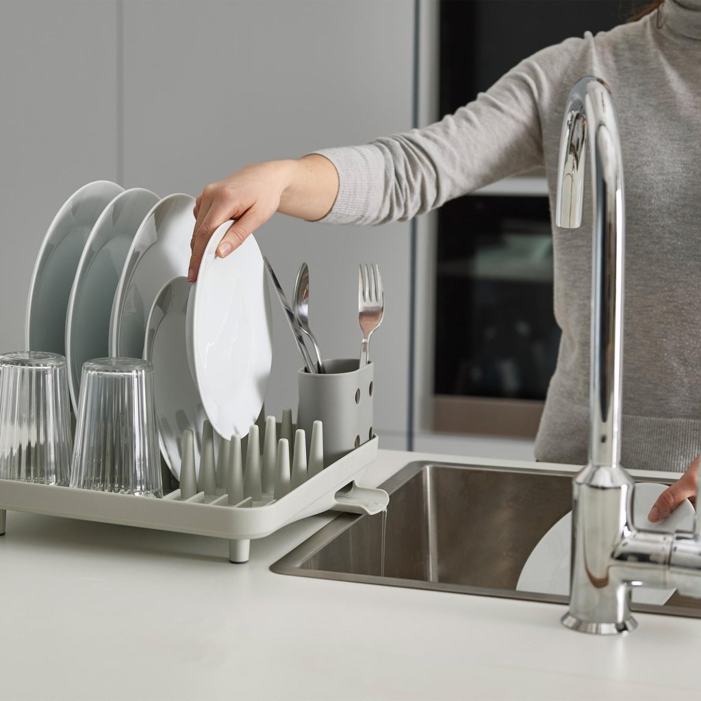 O design minimalista, linhas simples e divisão ponderada criam a sensação de que até a secagem comum de louça pode ter a sua ordem. Os pratos apoiam-se em pinos, os copos ficam seguros e os talheres não escorregam pelo fundo. De repente, não se trata apenas de arrumar a louça molhada, mas de um pequeno sistema que lhe devolve o controlo do espaço após cada lavagem.