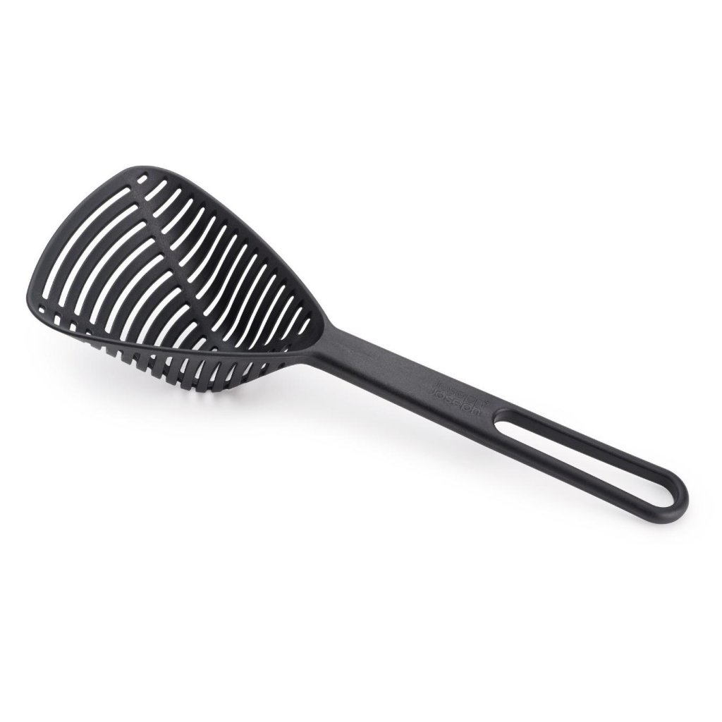 - A colher coadeira Joseph Joseph DUO 10553 permite pegar e coar rapidamente os alimentos diretamente da panela, sem a necessidade de escorrer água quente.