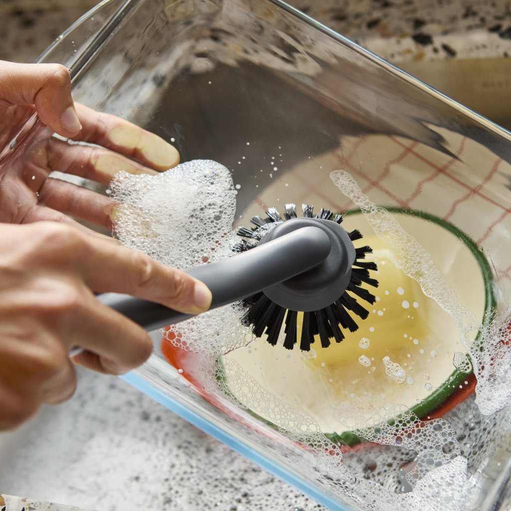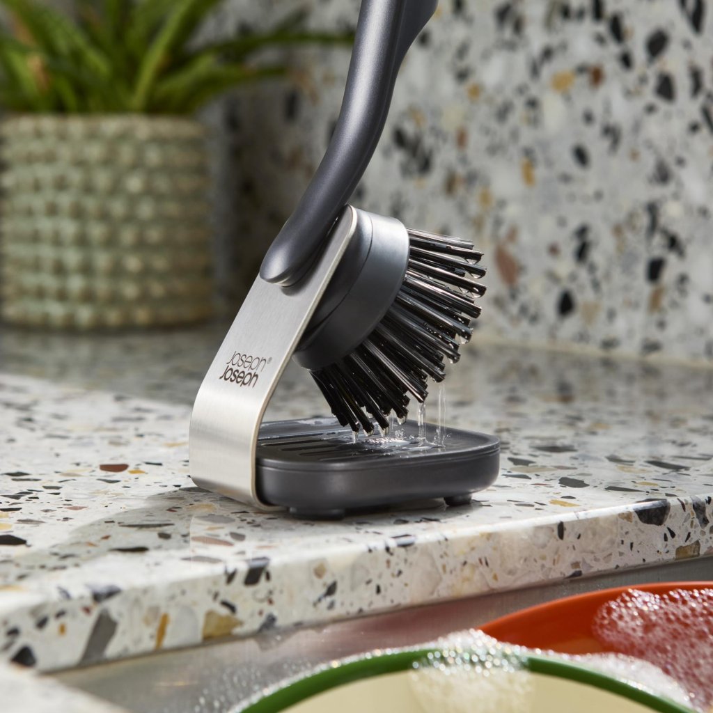 A loiça não se lava sozinha, mas pelo menos pode ter estilo. A escova com o seu próprio suporte parece ter um lugar fixo na hierarquia da cozinha, em vez de estar simplesmente largada junto ao lava-loiça. E você finalmente tem a sensação de que até a lavagem da loiça tem um sistema, e não apenas um caos molhado.