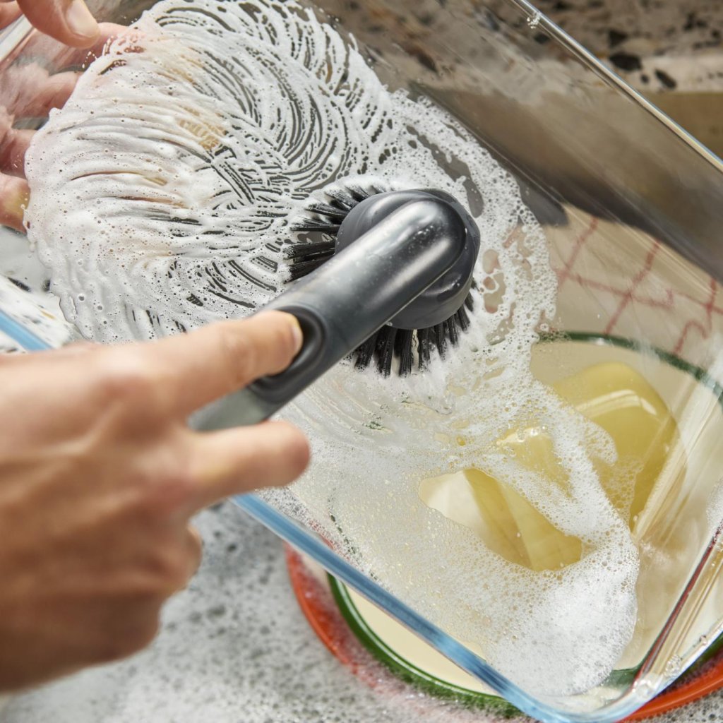 - A escova de louça integrada com dispensador de detergente ajuda a remover facilmente os restos de comida queimada de panelas, frigideiras ou travessas sem danificar a superfície.