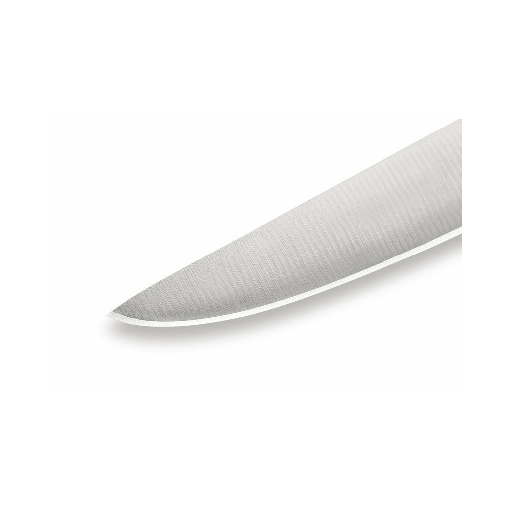 Esta faca de desossar com uma lâmina longa muito fina é particularmente eficaz para cortar ossos de todos os tipos de carne, peixe ou aves, separar pele, cartilagem, tecido muscular ou tendões. A lâmina afiada permite cortes profundos em filigrana e é capaz de aparar a carne de forma tão eficiente que não fica um grama de osso. A forma especial e a flexibilidade da lâmina permitem que a faca de desossar contorne facilmente até mesmo as articulações muito grandes.