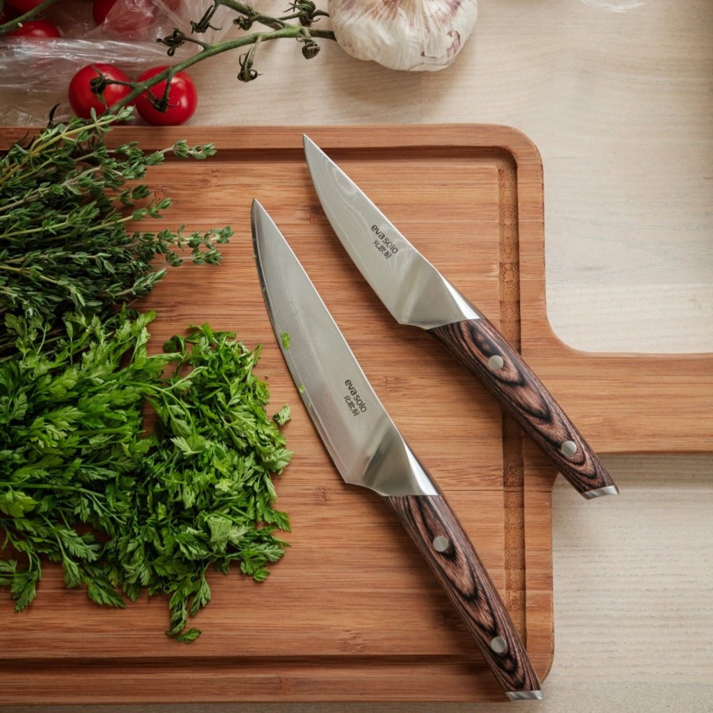 - o grão de madeira natural do cabo complementa o padrão Damasceno exclusivo da lâmina