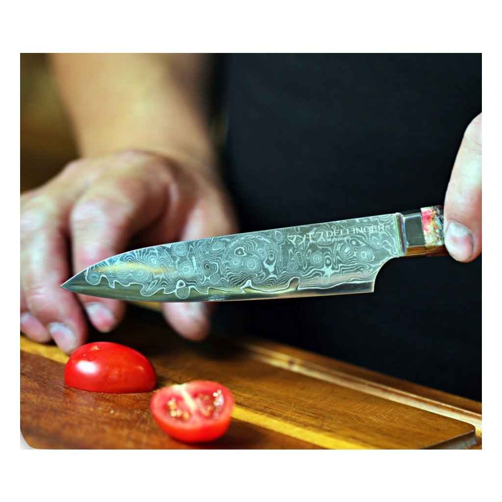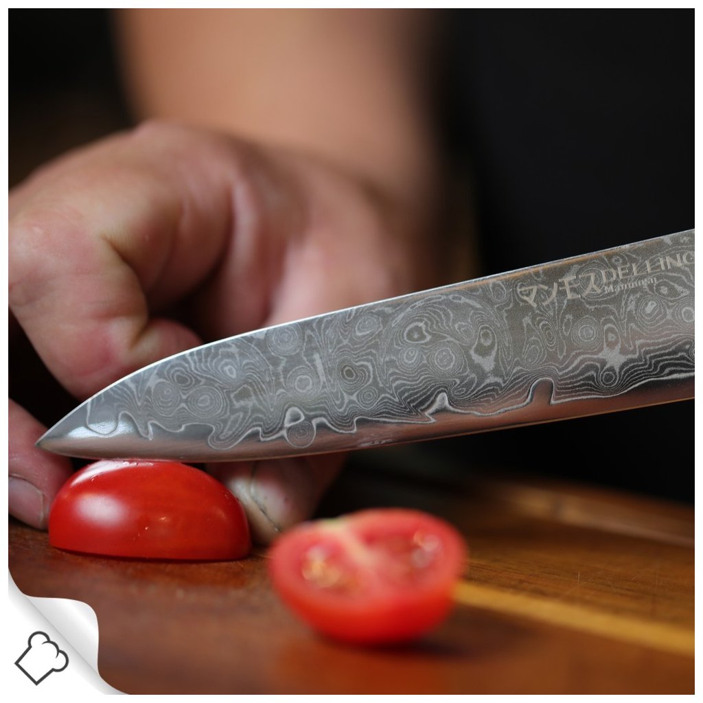 Esta faca de damasco é uma alternativa útil a uma faca de chefe grande quando é necessário efetuar cortes precisos ou, por exemplo, cortar feijão verde ou outros legumes e frutas mais pequenos. Também são adequados para espetar e cortar carne. A lâmina arredondada permite uma ligeira oscilação durante o corte. A sua nitidez é ideal para preparar sanduíches de todos os tipos. A lâmina longa e o cabo de estilo ocidental proporcionam-lhe o melhor controlo ao cortar e fatiar.