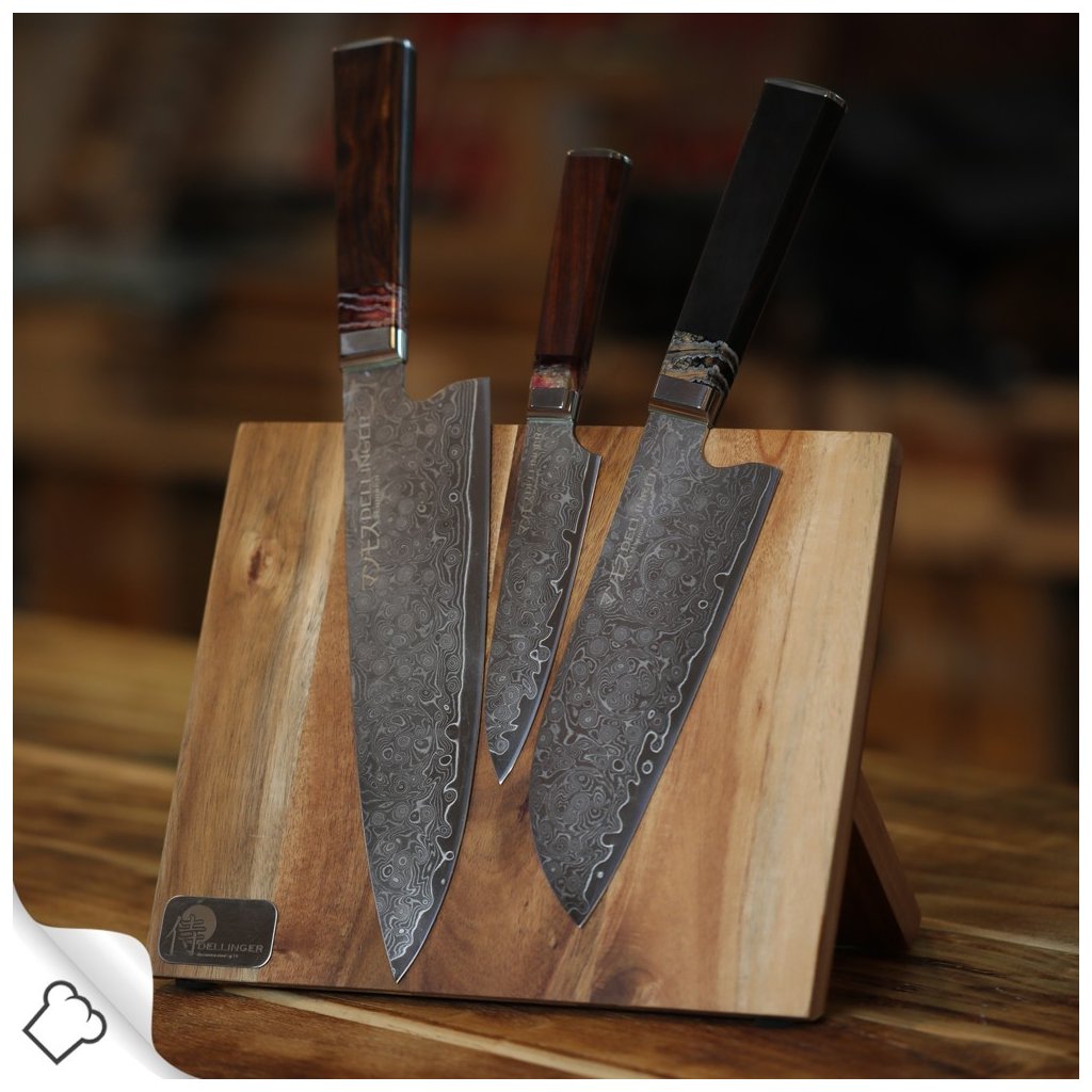 Tem um núcleo de corte ultra-afiado feito de aço vg10 japonês, que está muito bem protegido contra a corrosão. O aço vg10 japonês tem uma nitidez duradoura com uma dureza R62 +/- 1 Rockwell. O núcleo de aço vg10 japonês é ensanduichado entre 66 camadas de 2 aços damascus inoxidáveis (aço damasco), que proporcionam uma durabilidade e resistência excepcionais. Lâmina japonesa perfeitamente equilibrada e cónica, com um padrão damasceno cintilante ROSE minimiza a fricção durante o corte e evita que o material a cortar se agarre à lâmina. O padrão damasceno que lembra um jardim e rosas em flor ROSE é único, irrepetível e tornar-se-á um símbolo da sua individualidade.