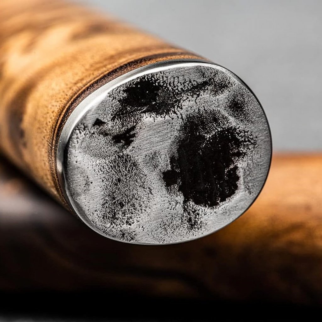 - a textura rústica da lâmina contrasta com o brilho suave do metal e o grão rico da madeira para criar um conjunto esteticamente distinto