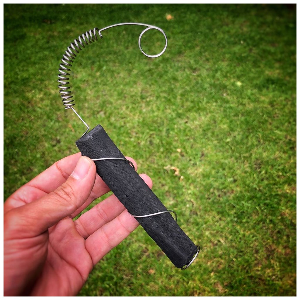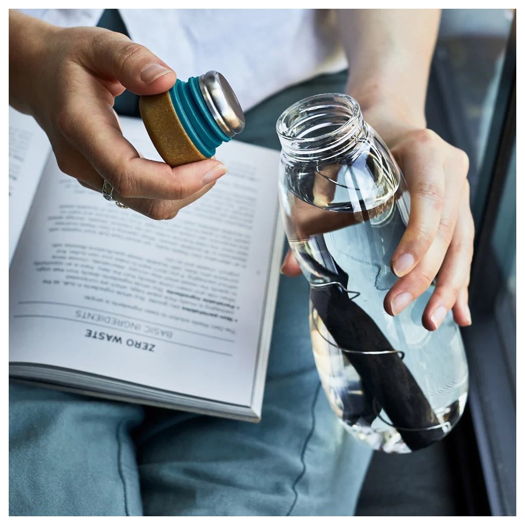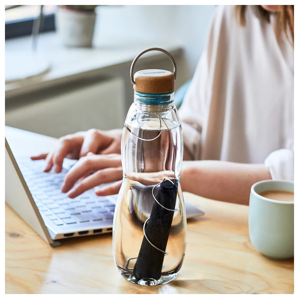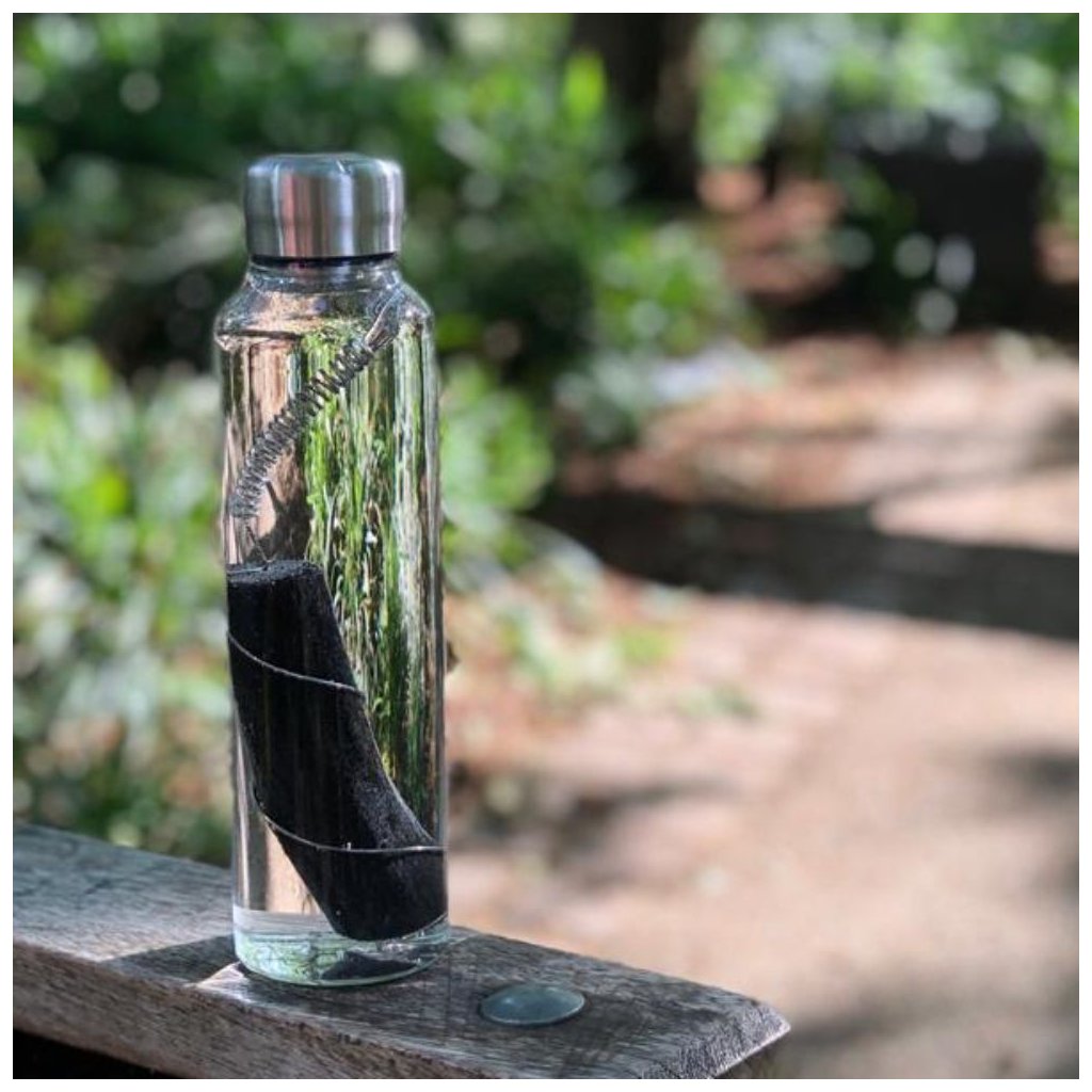 - o fio estabilizador de aço inoxidável garante que o binchotan não se desloca dentro da garrafa, mesmo quando está vazio (aplica-se a garrafas de viagem normais)