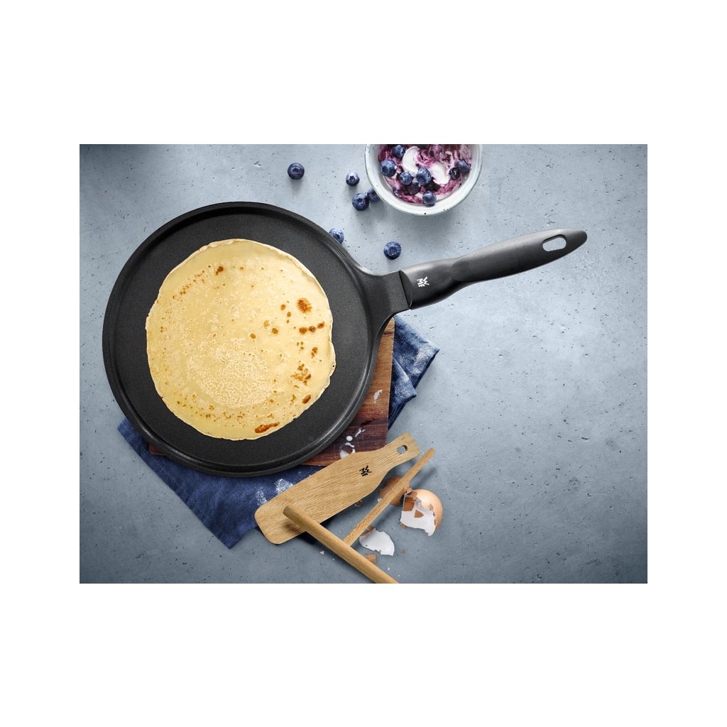 A frigideira para panquecas Devil do comprovado fabricante alemão WMF será apreciada por todos os amantes deste prato. Quais são as suas panquecas preferidas, o clássico da sua avó com marmelada de morango, a versão da sua mãe com queijo cottage e passas de rum generosamente polvilhadas com açúcar baunilhado ou prefere uma versão salgada moderna, por exemplo, com salmão e um ovo perdido? Com a frigideira de alumínio fundido antiaderente e leve da WMF, pode preparar panquecas e omeletes de 100 maneiras com facilidade.