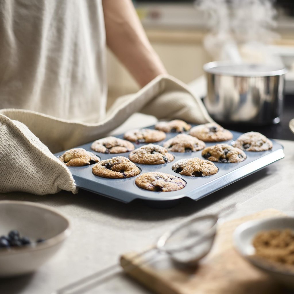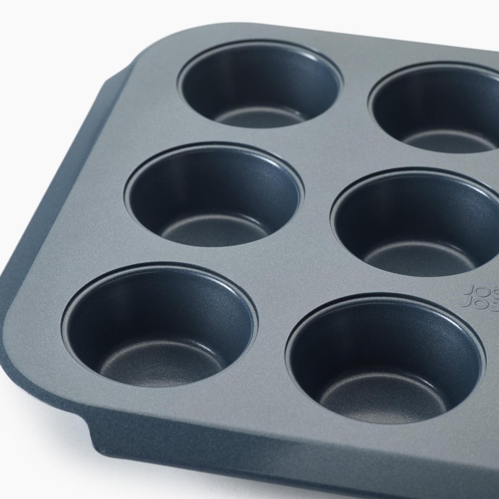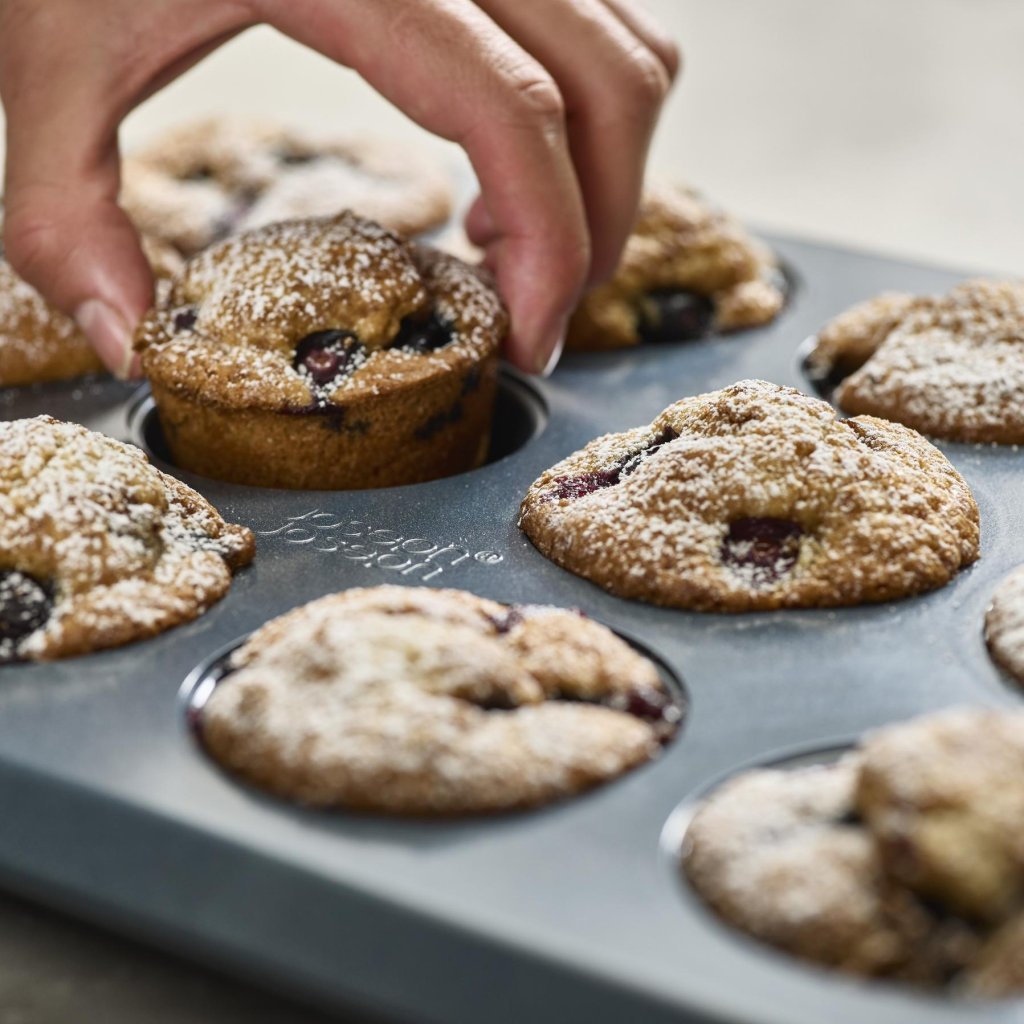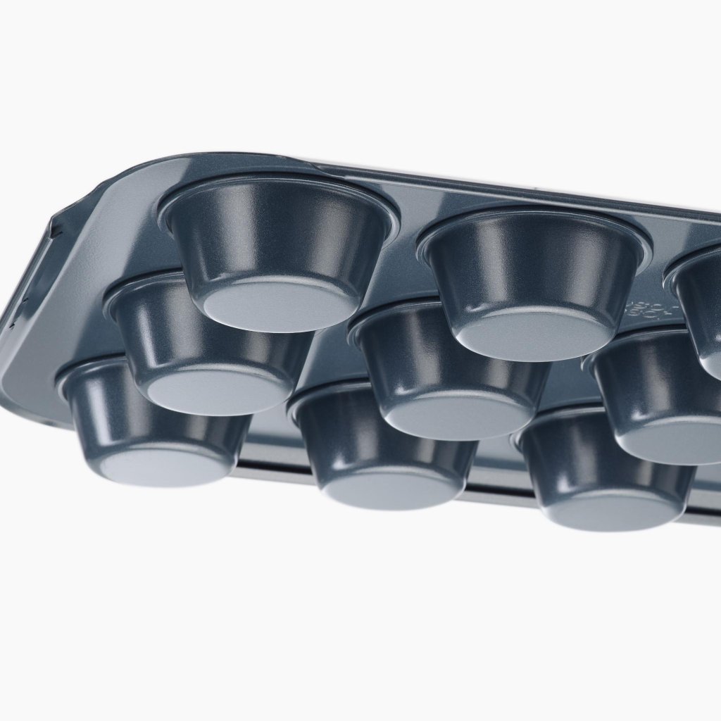 - A superfície antiaderente de dupla camada permite a fácil remoção dos muffins assados sem grudar e facilita a limpeza rápida após o cozimento.