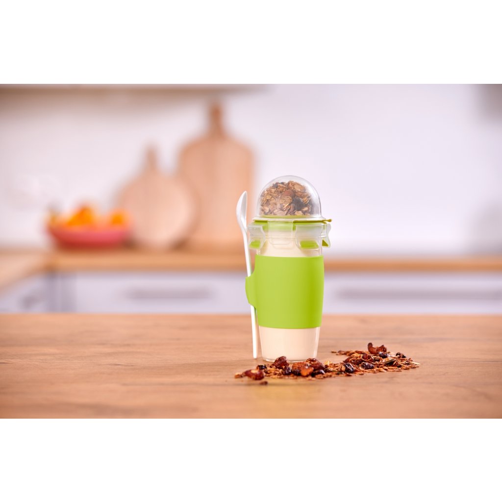 Este frasco de iogurte com uma capacidade de 0,45 l é feito de plástico de alta qualidade e duradouro que pode ser utilizado no micro-ondas, na máquina de lavar louça ou no congelador. Tem uma tampa 100% à prova de fugas para uma frescura 2x maior dos alimentos armazenados e segurança contra derrames, uma colher e um compartimento separado para cereais, frutos secos ou outros ingredientes favoritos. Na produção foram utilizados apenas materiais seguros para a saúde e sem BPA(fábrica certificada). Também pode armazenar alimentos para bebés no recipiente com uma garantia de 30 anos (a marca Tefal é certificada para o armazenamento de alimentos para bebés).