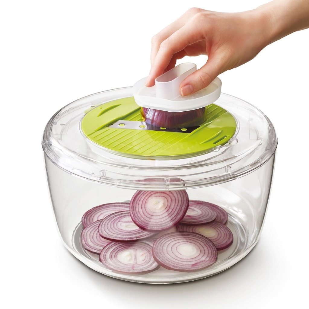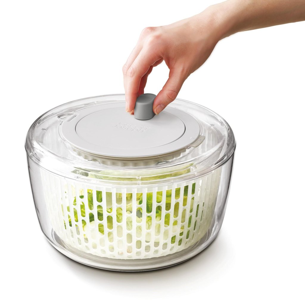 - A base é uma centrífuga rotativa que, após enxaguar, seca as folhas de salada de forma suave e eficiente para que permaneçam crocantes e prontas para servir imediatamente.