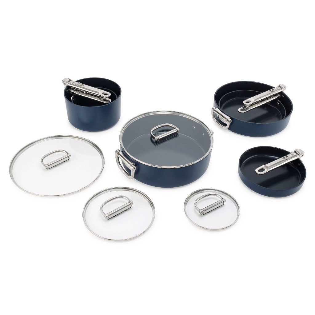 - O conjunto inclui panelas com diâmetro de 15 cm e 19 cm com tampas, frigideiras com diâmetro de 20 cm e 24 cm, uma frigideira com tampa com diâmetro de 28 cm e uma panela com diâmetro de 28 cm com tampa.