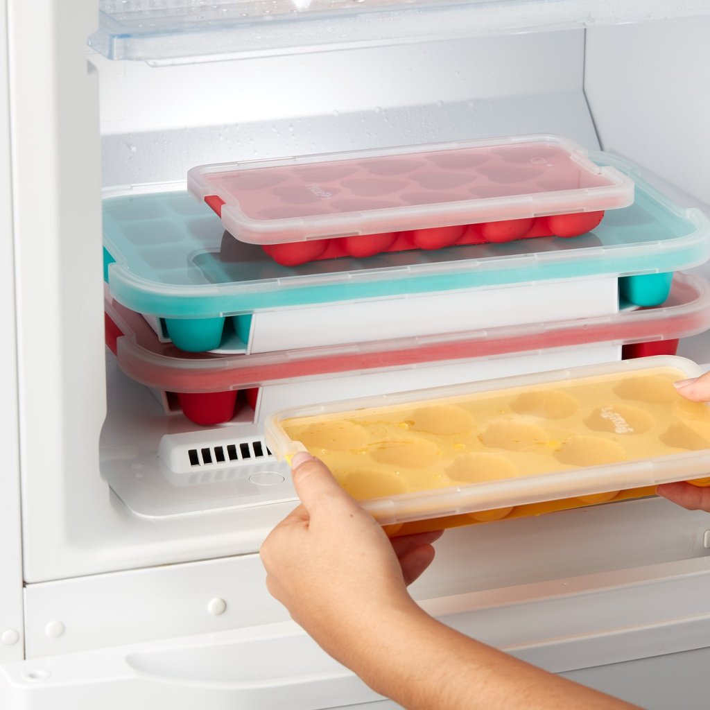 - a tampa também permite o empilhamento seguro do molde e de outros recipientes e poupa espaço quando armazenado no congelador