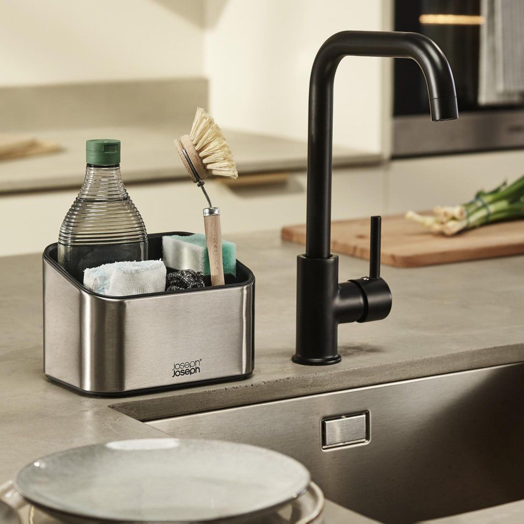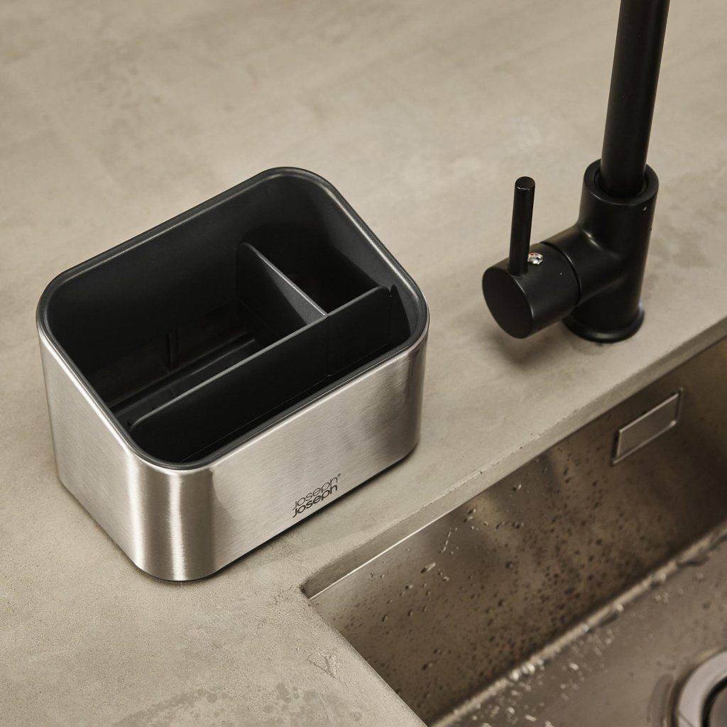 - O Organizador de pia SURFACE em aço inoxidável oferece uma solução elegante e pensada para organizar os utensílios de lavagem diretamente na pia da cozinha.