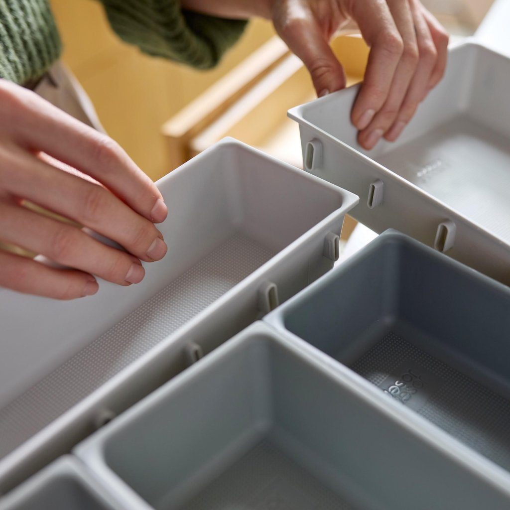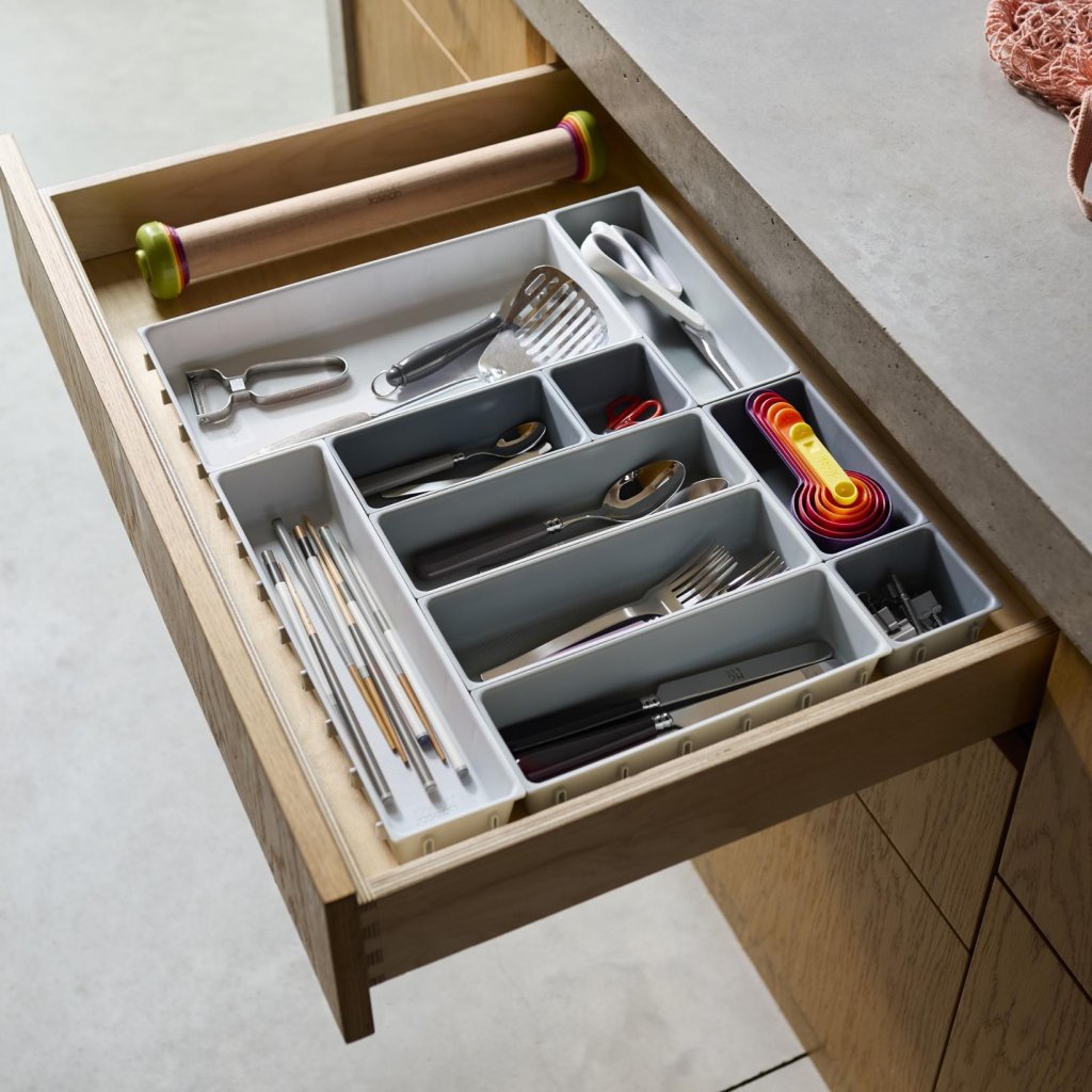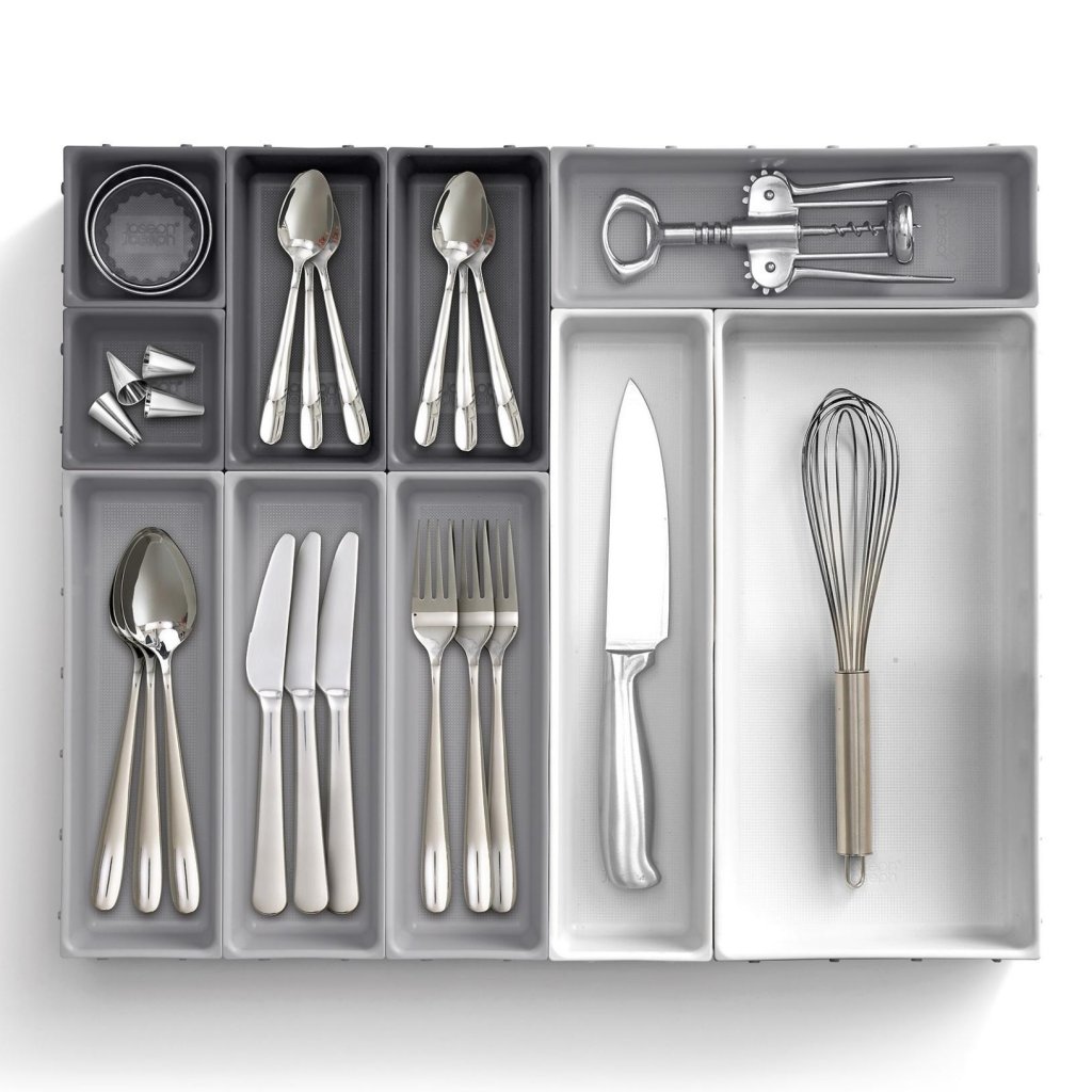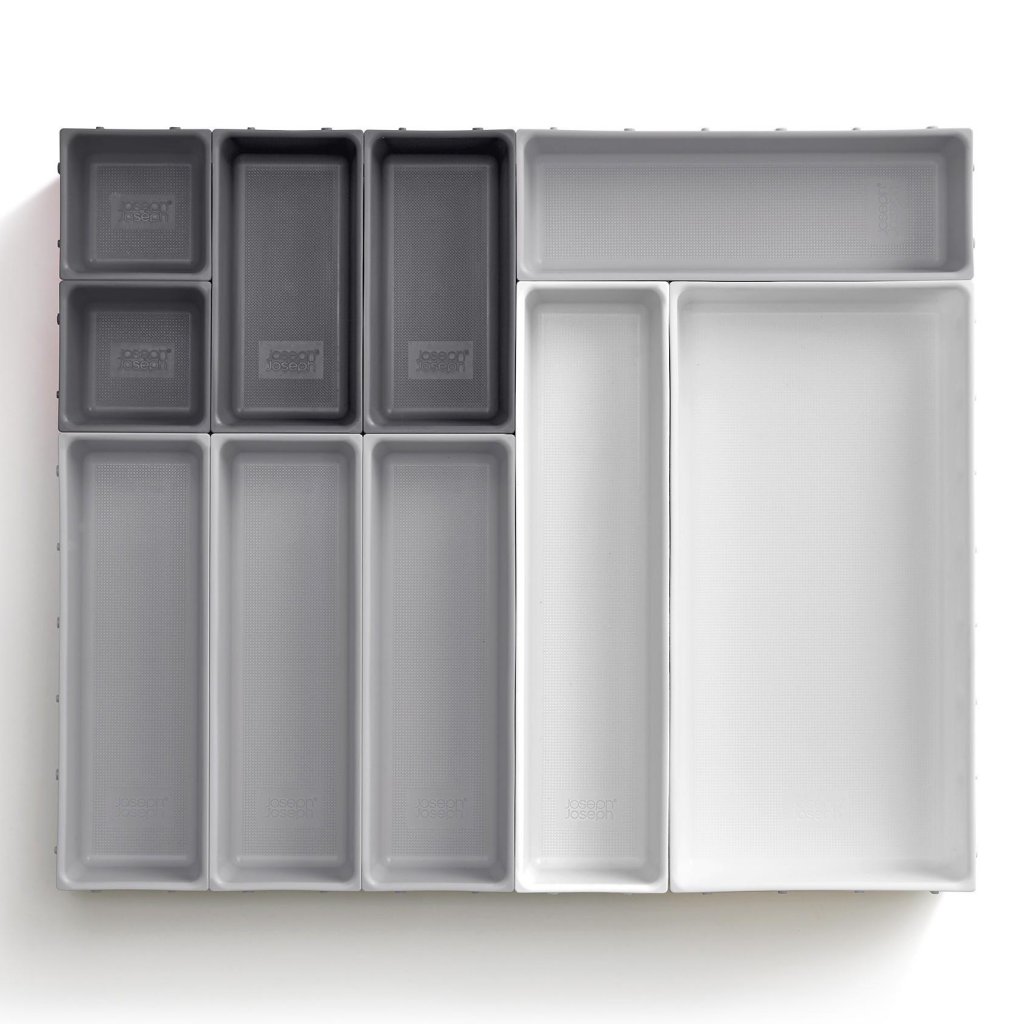 - O organizador de gaveta Joseph Joseph BLOX oferece um sistema modular prático que ajuda a organizar de forma clara talheres, utensílios de cozinha, material de escritório ou pequenas ferramentas.