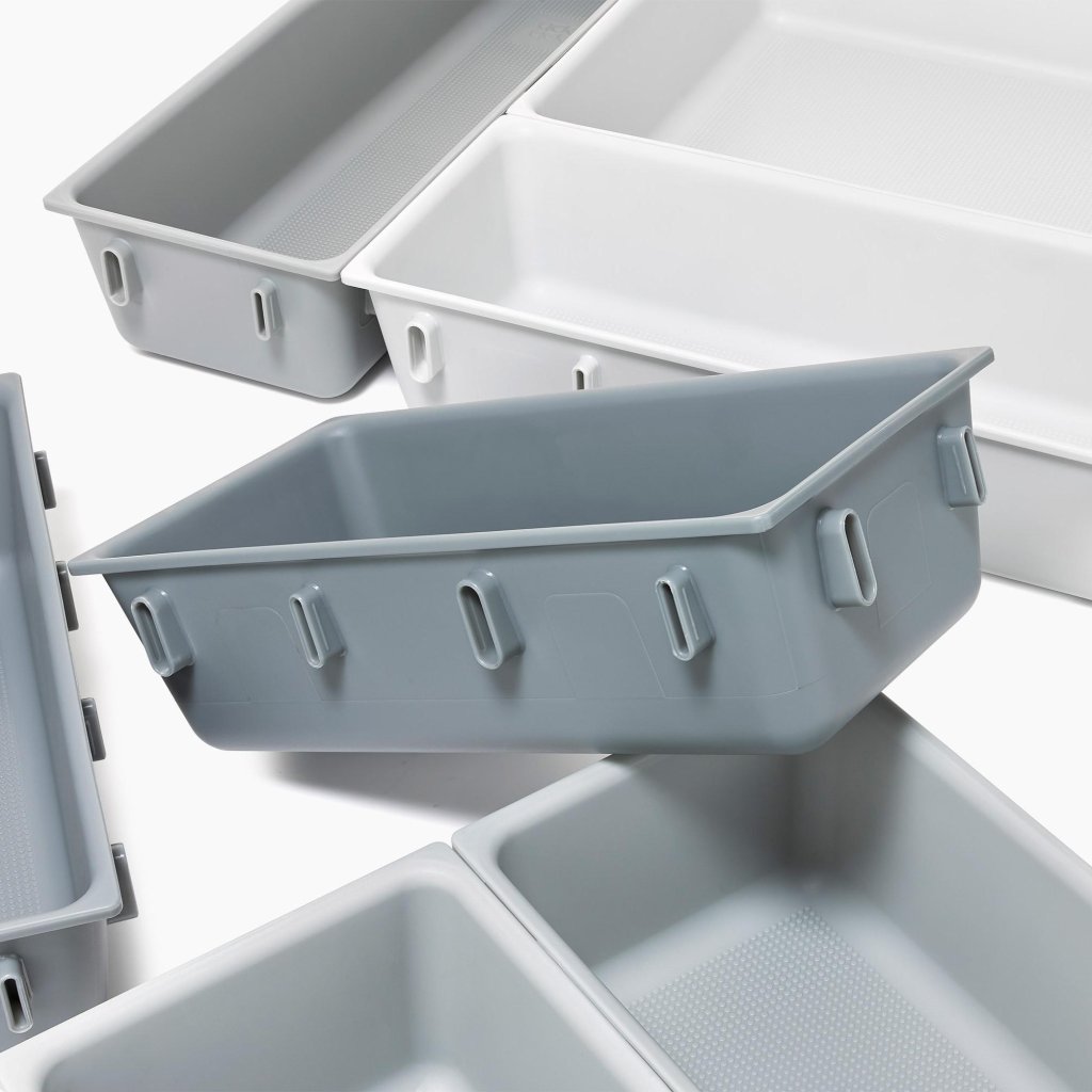 - A construção modular permite combinar as partes individuais conforme necessário e adaptar o organizador a diferentes tipos de gavetas na cozinha, escritório ou oficina.
