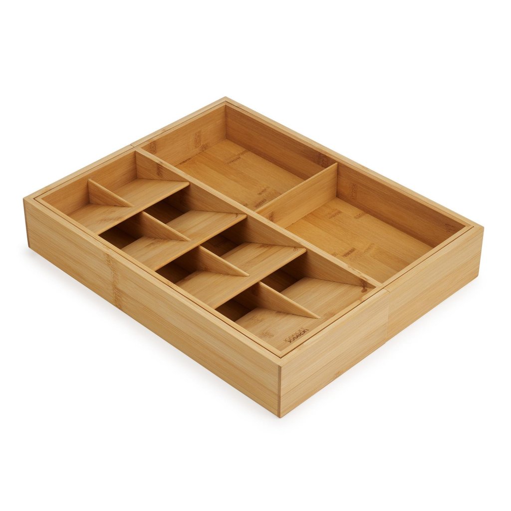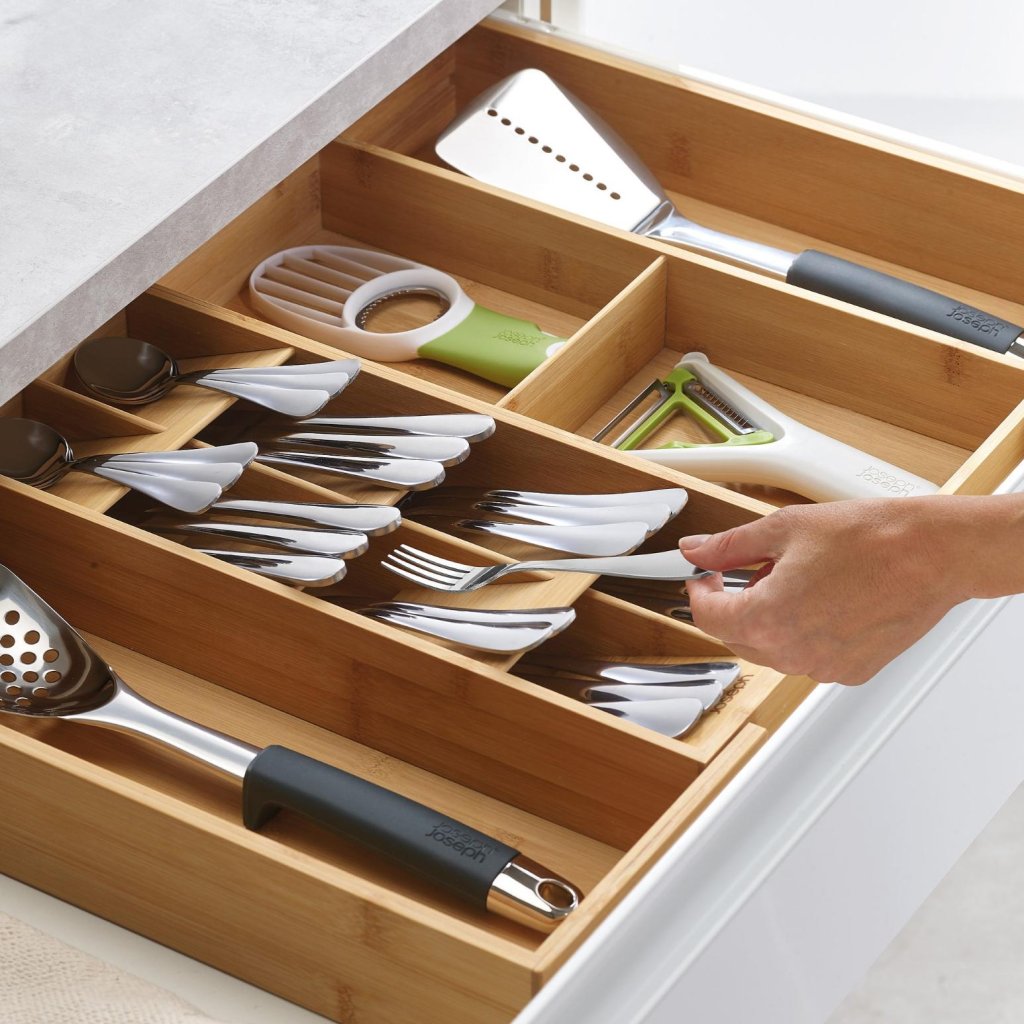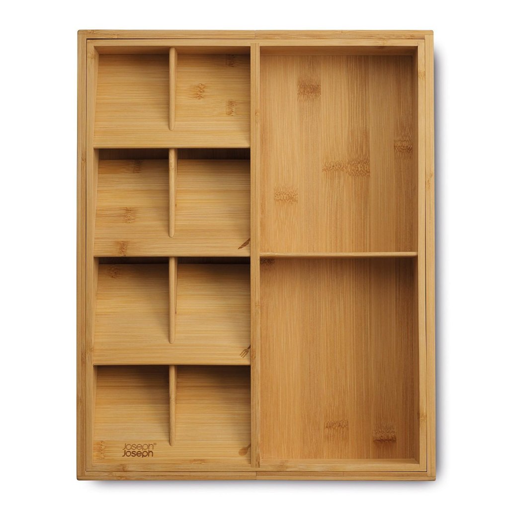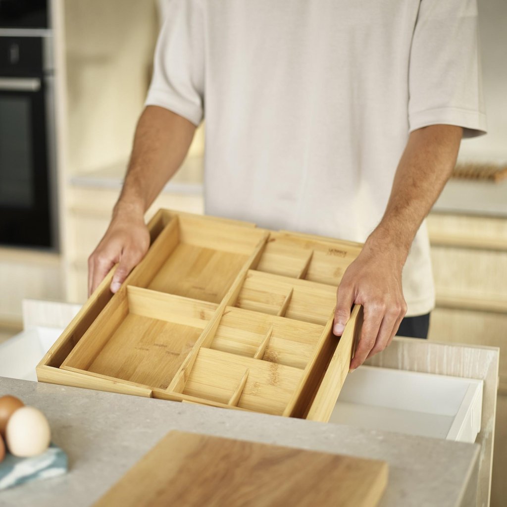 - O organizador de gaveta Joseph Joseph DRAWERSTORE em bambu natural ajuda a organizar talheres, utensílios de cozinha e pequenos ajudantes de forma clara, tornando o trabalho diário na cozinha muito mais confortável.