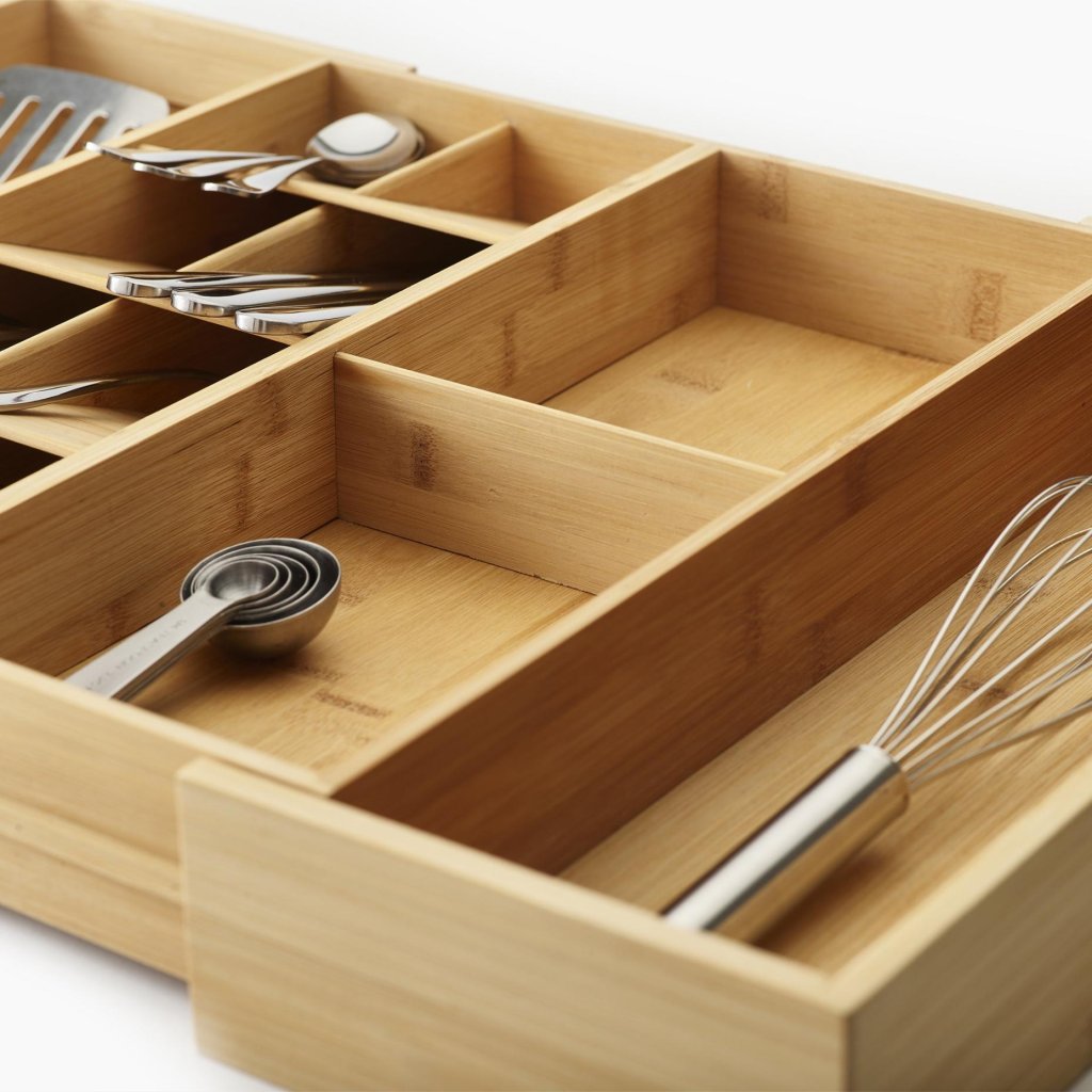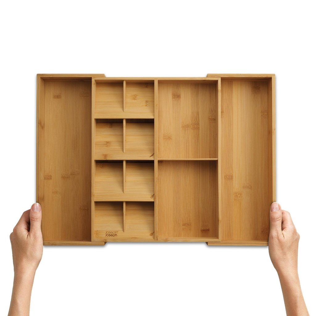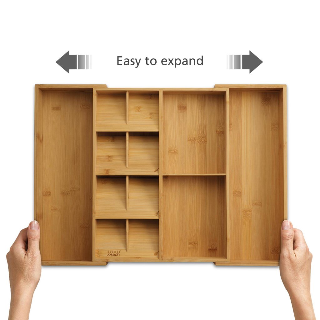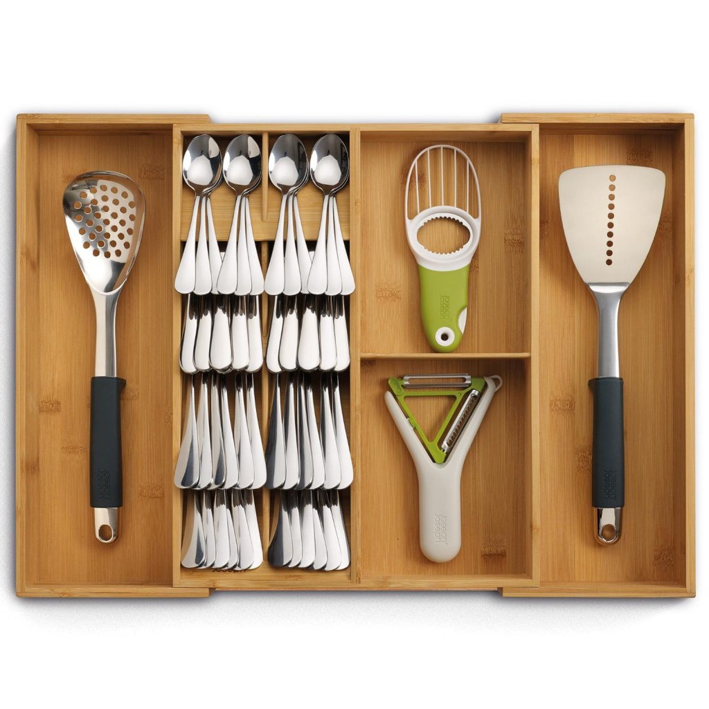 - O organizador de gaveta Joseph Joseph DRAWERSTORE em bambu natural ajuda a organizar talheres, utensílios de cozinha e pequenos ajudantes de forma clara, tornando o trabalho diário na cozinha muito mais confortável.