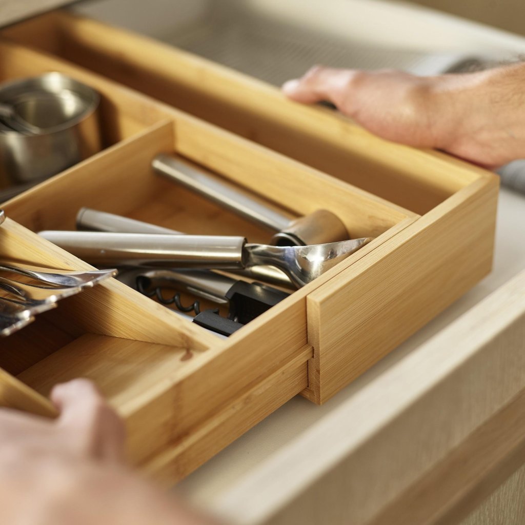 - As partes laterais extensíveis permitem adaptar o organizador à largura da gaveta, criando ao mesmo tempo espaço para utensílios de cozinha maiores.