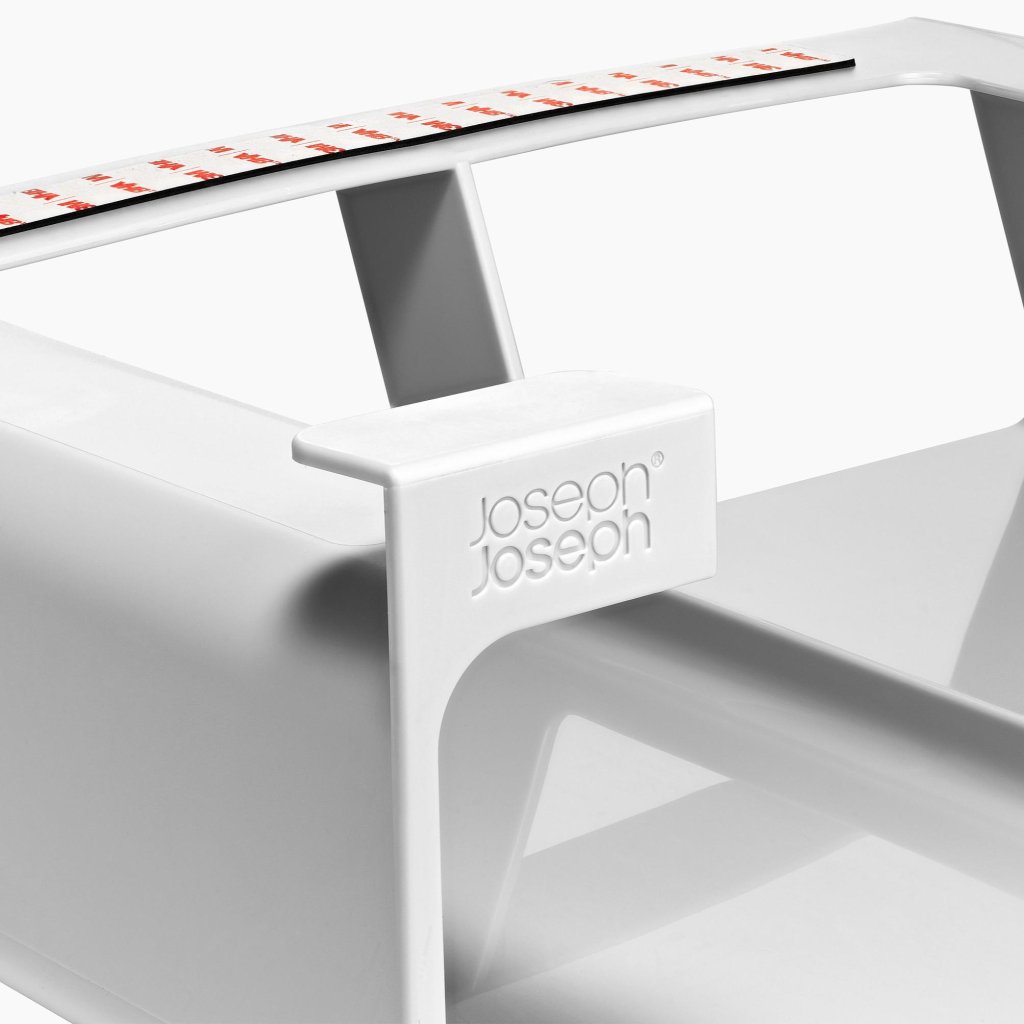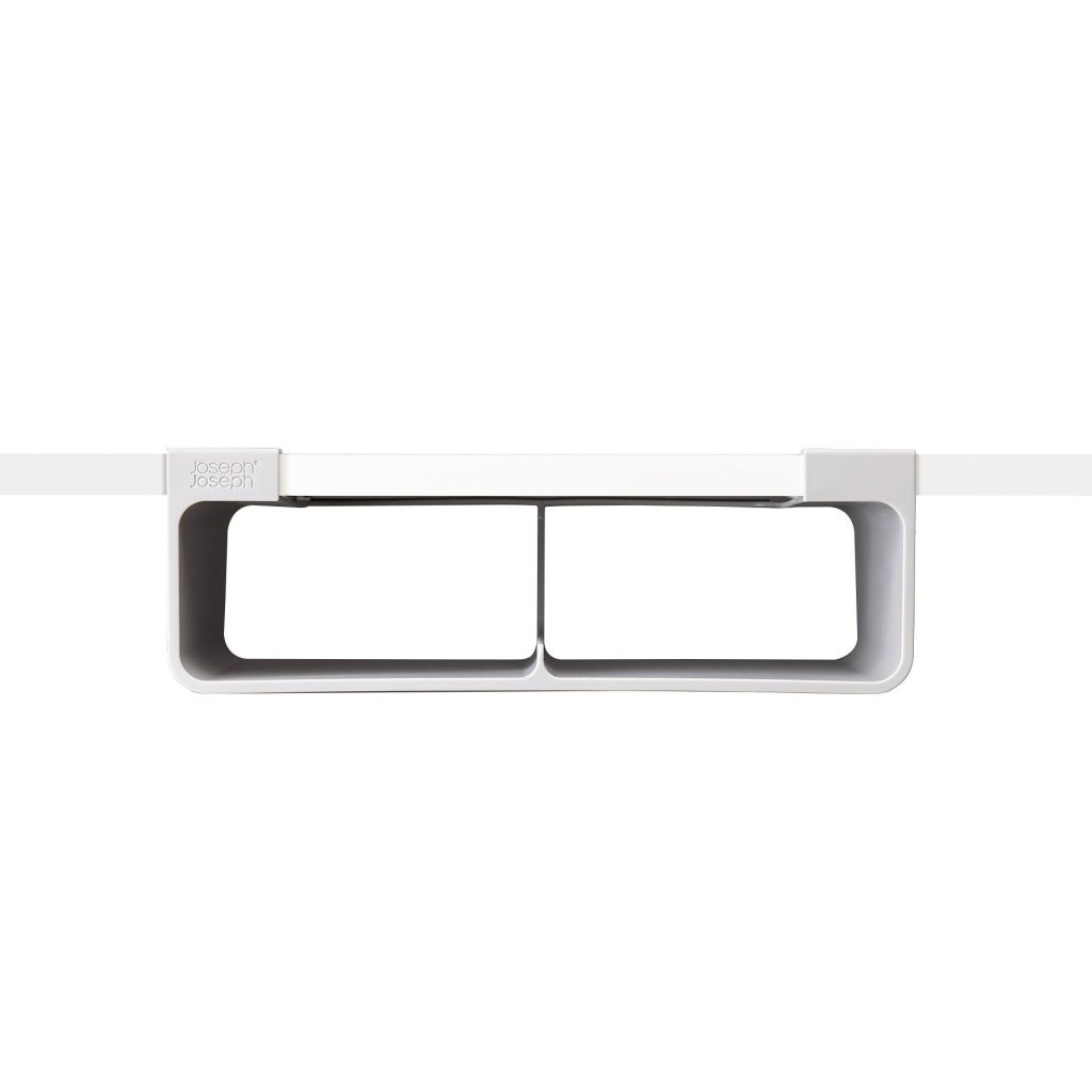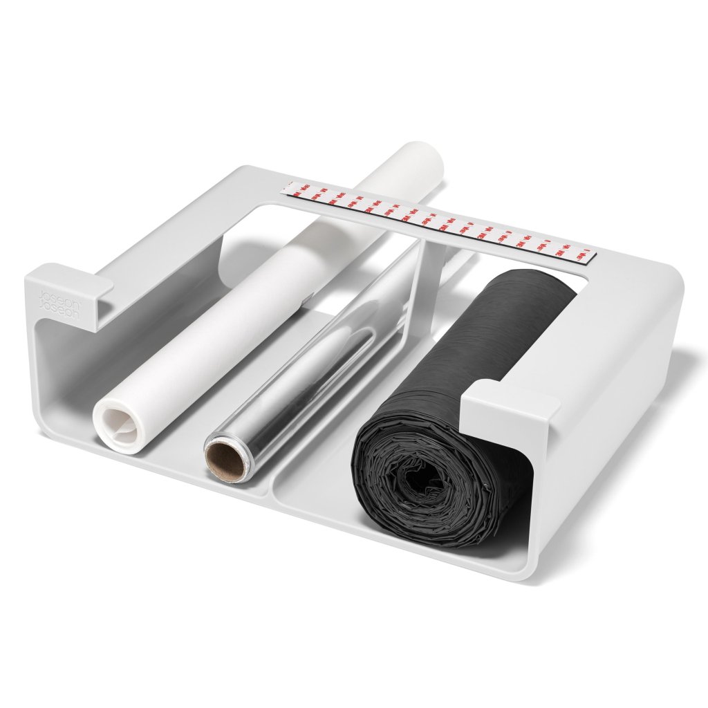 - O organizador Joseph Joseph CUPBOARDSTORE ajuda a aproveitar o espaço livre debaixo da prateleira do armário da cozinha, criando um local prático para guardar rolos de película alimentar, papel de alumínio ou sacos.