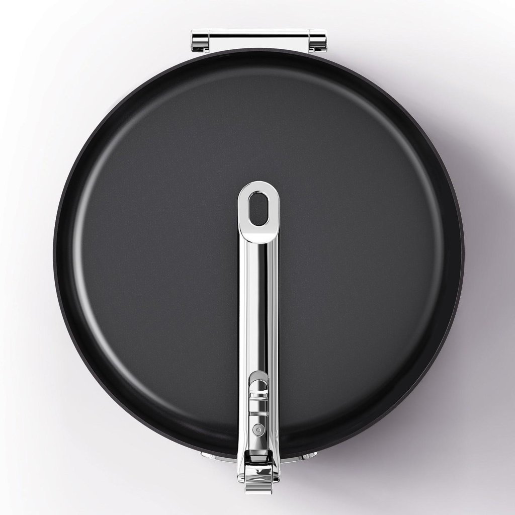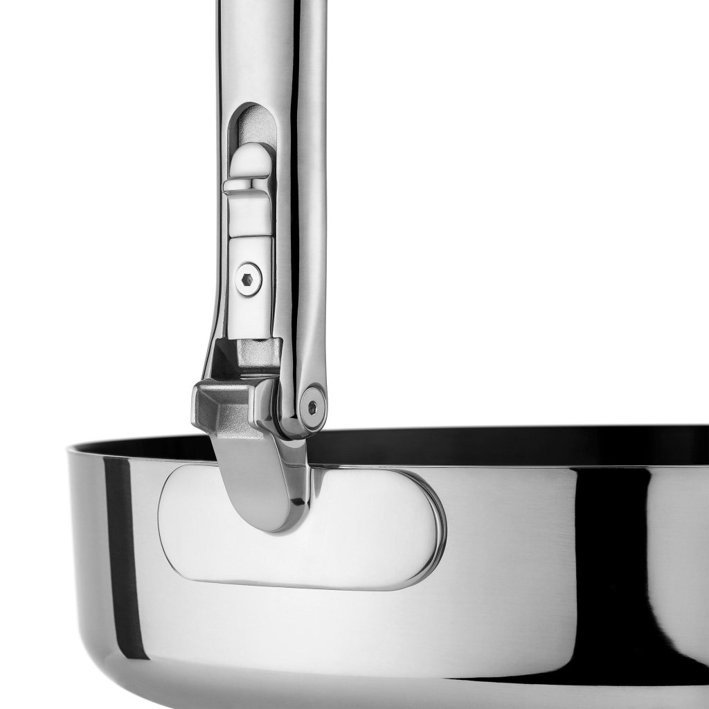 - A pega auxiliar também é rebatível, o que permite arrumar a frigideira de forma compacta e manter a máxima poupança de espaço.