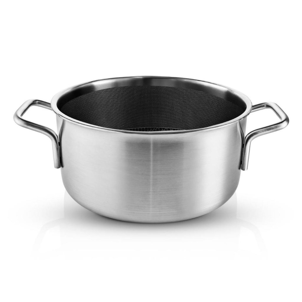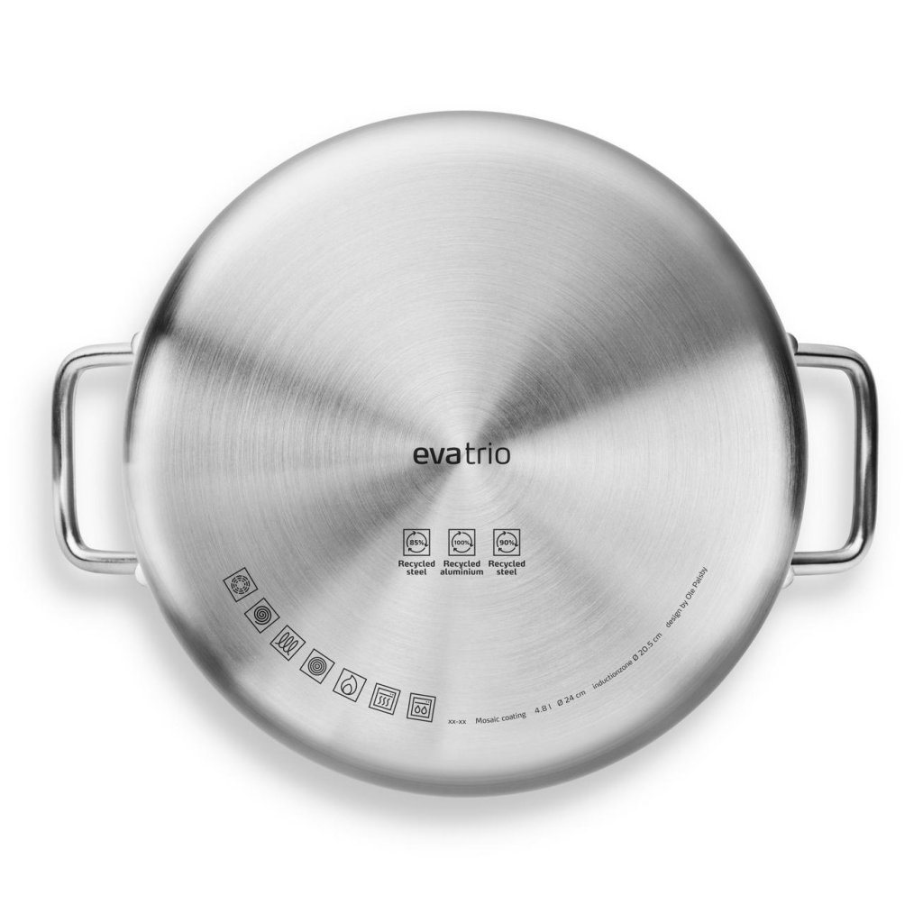 - O panela de cozimento de aço inoxidável de 4,8 litros combina o design tradicional EVA TRIO com materiais inovadores para um melhor cozimento