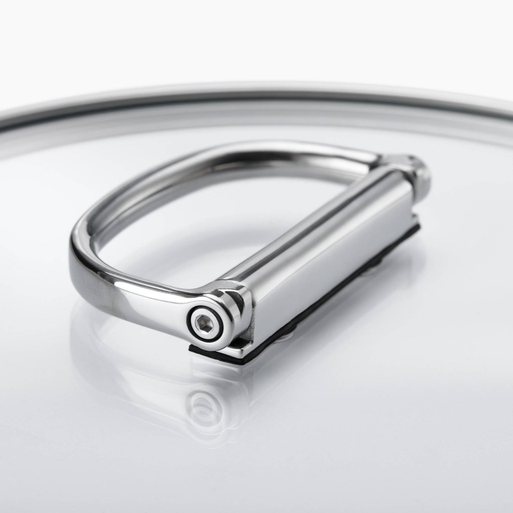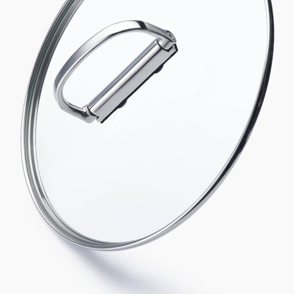 - Inclui um copo de vidro temperado tampa de vidro para panela com borda de aço inoxidável e uma alça dobrável também em aço inoxidável para armazenamento compacto e transparente.