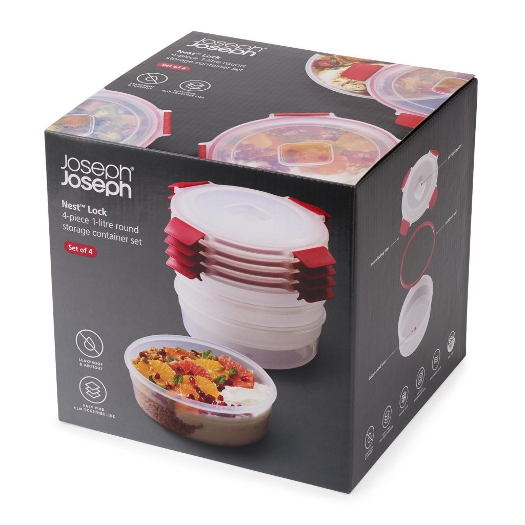 - O conjunto de recipientes para alimentos Joseph Joseph NEST LOCK de 1 l em formato redondo oferece uma solução prática para o armazenamento, transporte e aquecimento diários das suas refeições favoritas, em casa ou em viagem.