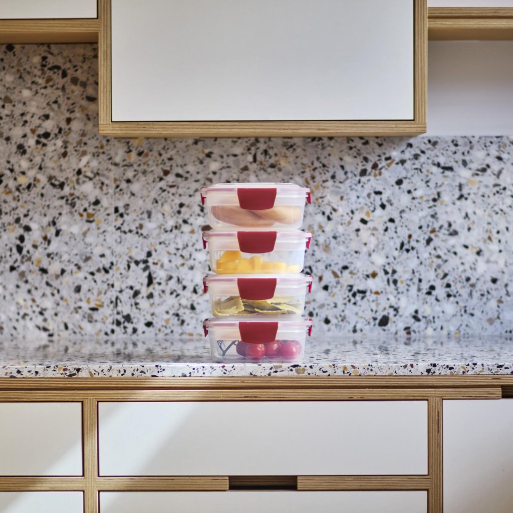 - O design inteligente e poupador de espaço permite encaixar os recipientes uns nos outros, para que não ocupem espaço desnecessário no armário ou na gaveta, mantendo a cozinha organizada e arrumada.