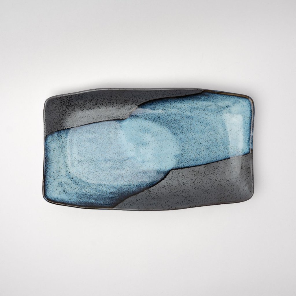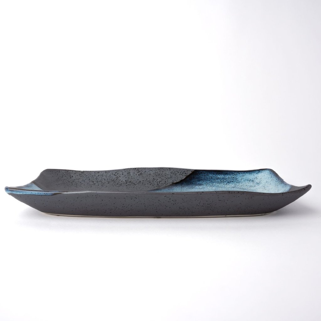 - Prato de servir STORM, com 30 cm de comprimento, impressiona com seu formato moderno e combinação singular de esmalte azul e preto, que remete ao movimento das ondas do mar.
